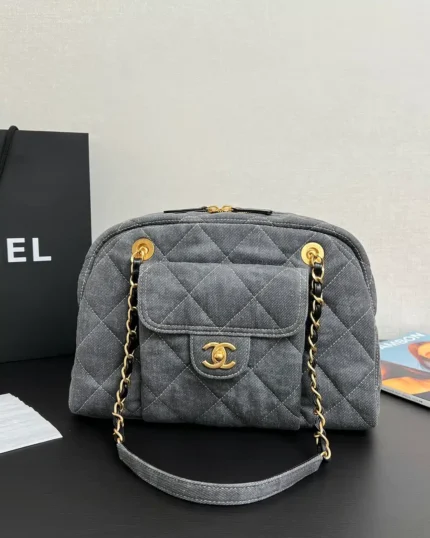 Washed Denim Quilted Bowling Bag ??Light Grey??