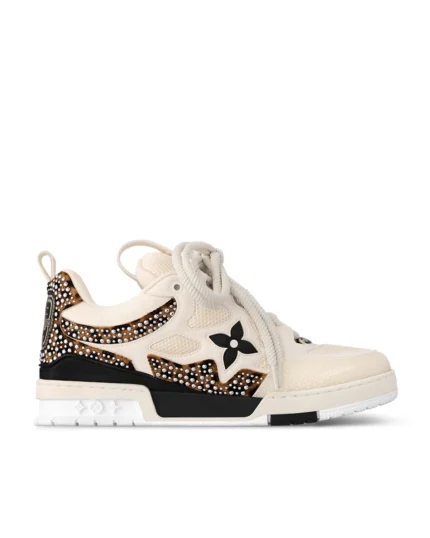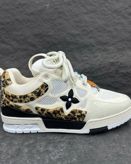The Louis Vuitton Skate sneaker brings back a 90s-inspired silhouette, blending technical mesh with python-embossed leather for a bold, fashion-forward look. Featuring a padded collar, cushioned tongue, and a technical lining with the iconic Monogram print, this sneaker perfectly balances luxury and comfort. Its bicolor rubber outsole, detailed with signature Monogram Flowers, enhances both durability and design.