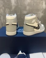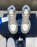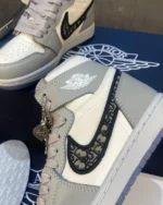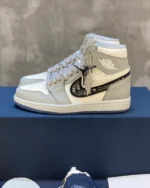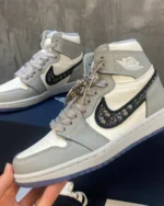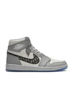 One of the most highly anticipated sneaker releases in history, the Dior x Air Jordan 1 High represents the groundbreaking union of high fashion and basketball heritage. This limited-edition sneaker blends the iconic Air Jordan 1 silhouette with the luxury craftsmanship of Dior. Crafted from premium wolf grey and sail white Italian leather, it features Dior??s signature monogram Jacquard pattern inside a translucent grey Swoosh. Finished with co-branded Air Dior detailing on the tongue and wings logo, this is a statement piece for collectors and style connoisseurs alike.