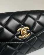 This black quilted calfskin belt bag features a flap. Crafted from black diamond-quilted calfskin, this belt bag features a front flap with a polished gold CC-shaped turnlock clasp. It opens to a black leather interior with a zippered pocket.