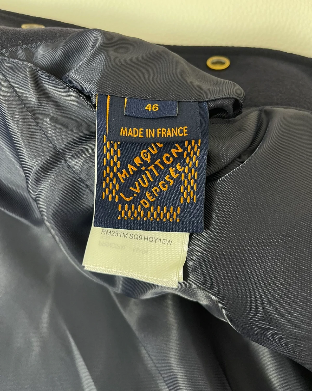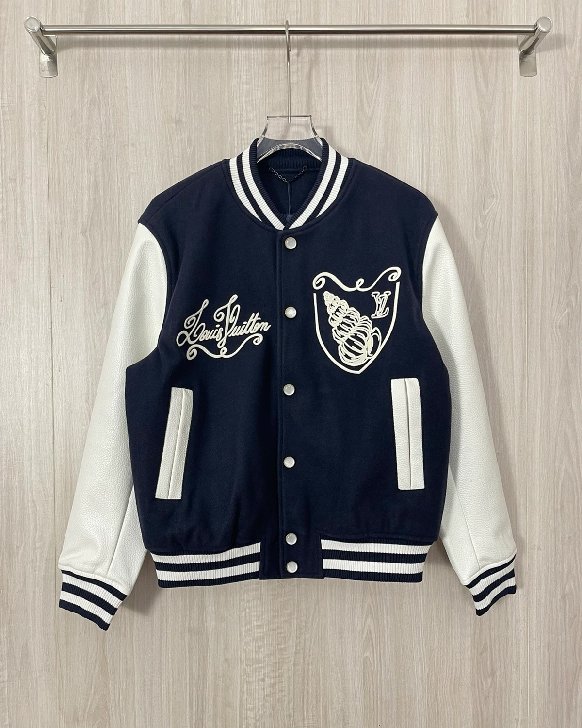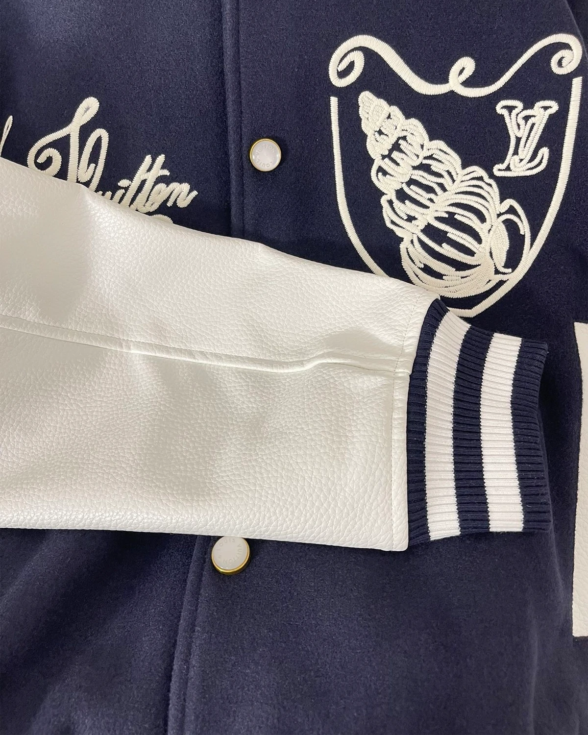 This elegant navy blue varsity jacket with white leather sleeves brings a maritime twist to an iconic silhouette. The compact wool body is adorned with contrasting Seashells embroidery, with a retro signature and a delicate shell motif on the chest, and a graphic resembling a sailor??s knot on the back. Pearl-effect snap buttons add a sophisticated twist to this casual yet distinguished piece.