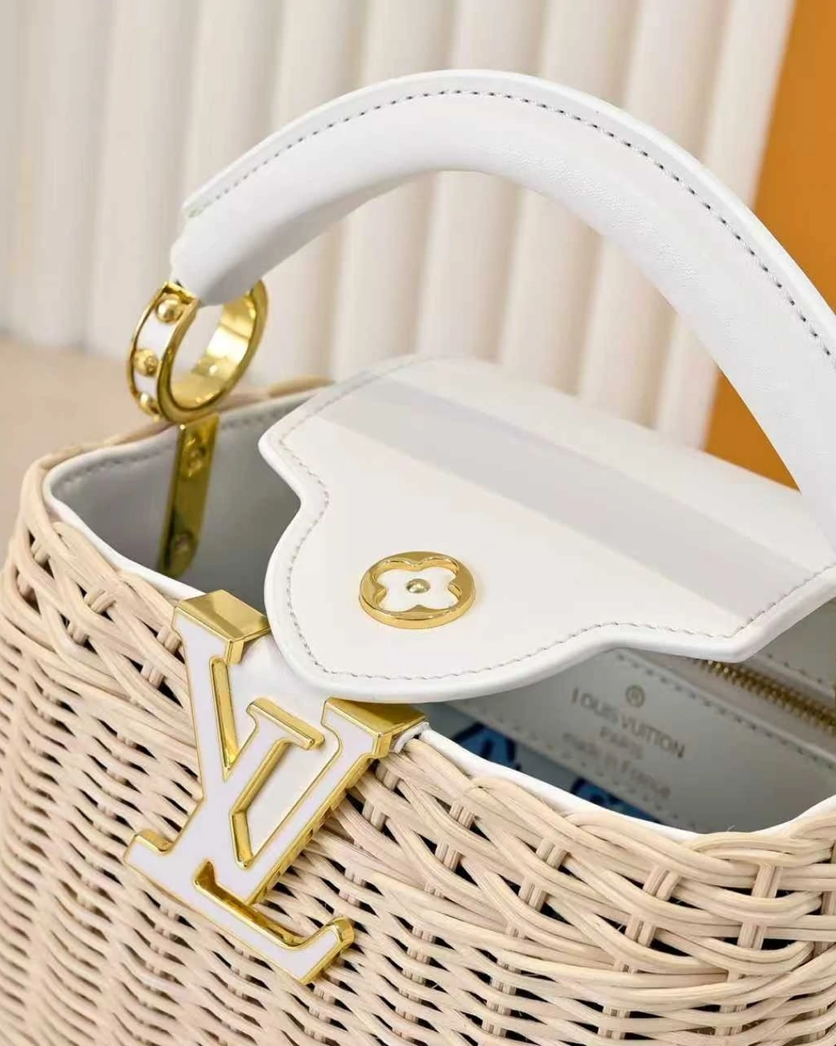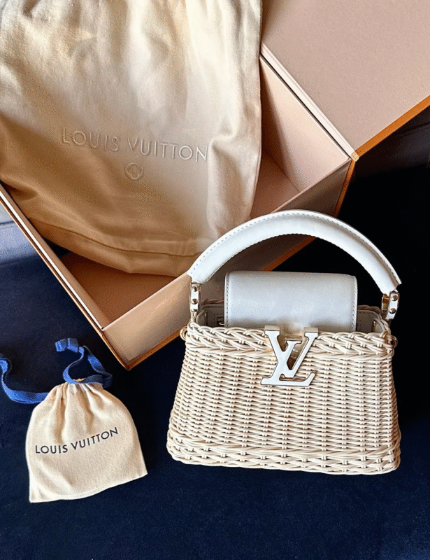 This Capucines Mini bag is inspired by? historic Picnic trunk, launched in 1892. Its unique design, meticulously handcrafted from rattan over two days, features leather trim and an iconic? Initials logo with an elegant gold-tone finish. Perfect for summer, this style can be worn across the body, over the shoulder, or by hand.