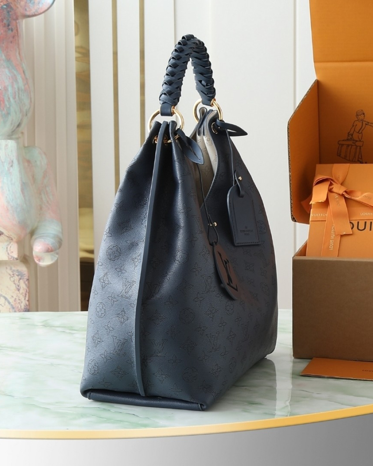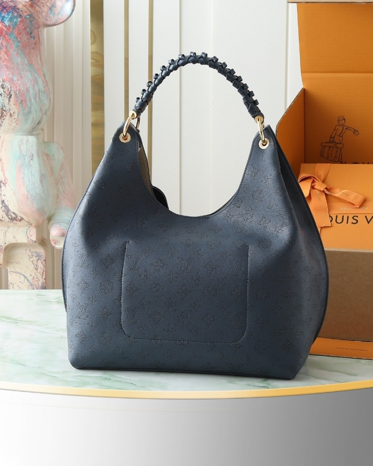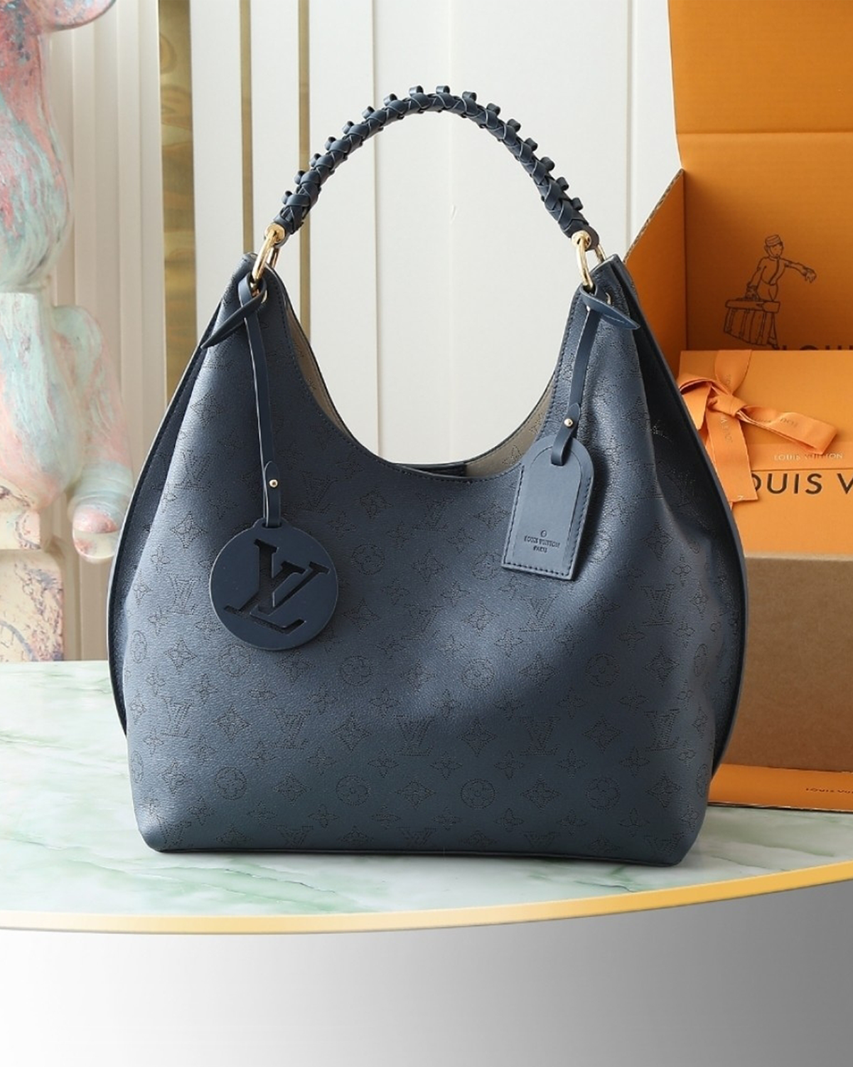 This elegant edition of the Carmel handbag is crafted from Mahina calfskin, delicately perforated with the House??s signature Monogram. Sized to store daily essentials, including a laptop, the versatile design is elevated with a removable leather braided charm. Note the address tag, which pays tribute to heritage Louis Vuitton trunks.