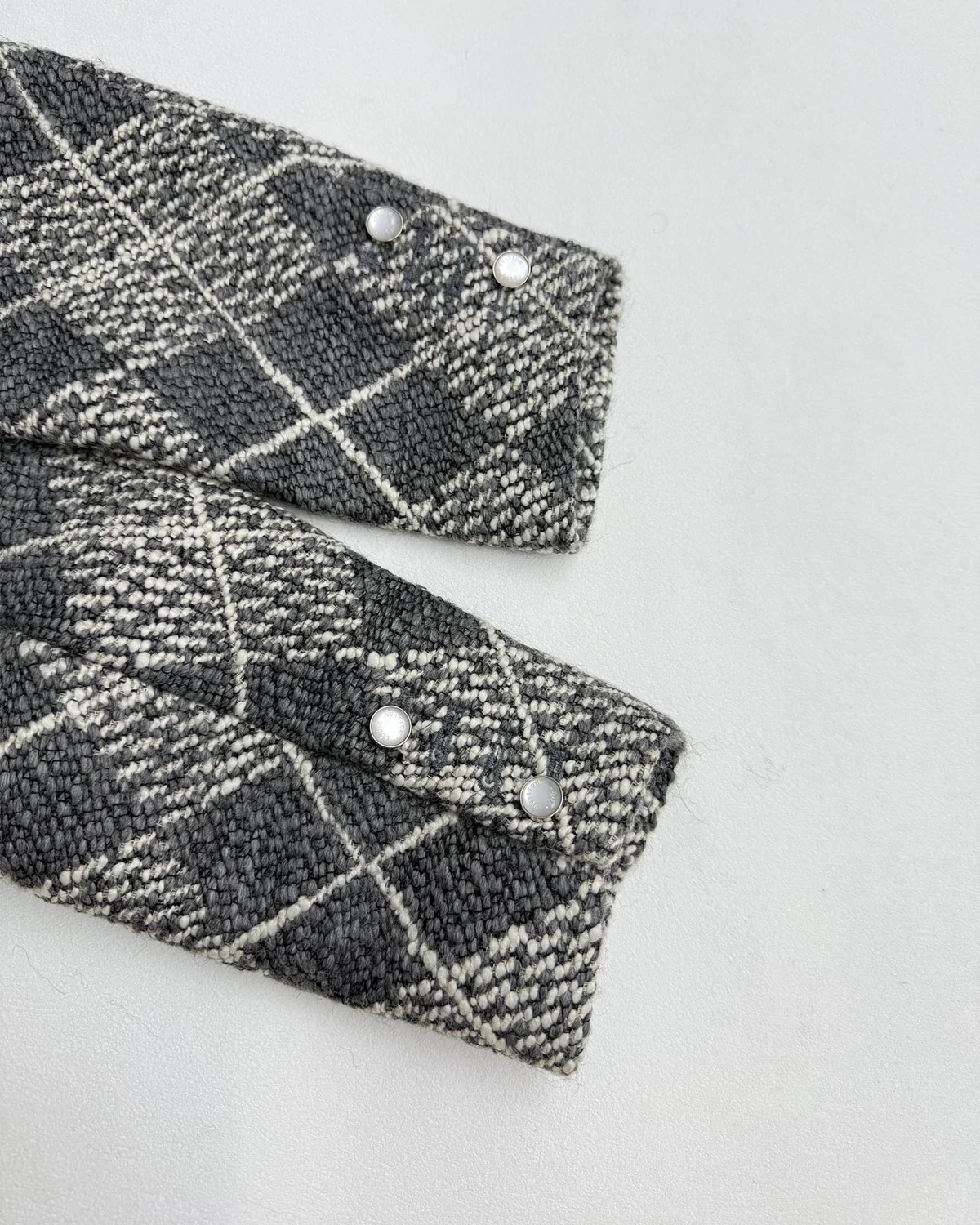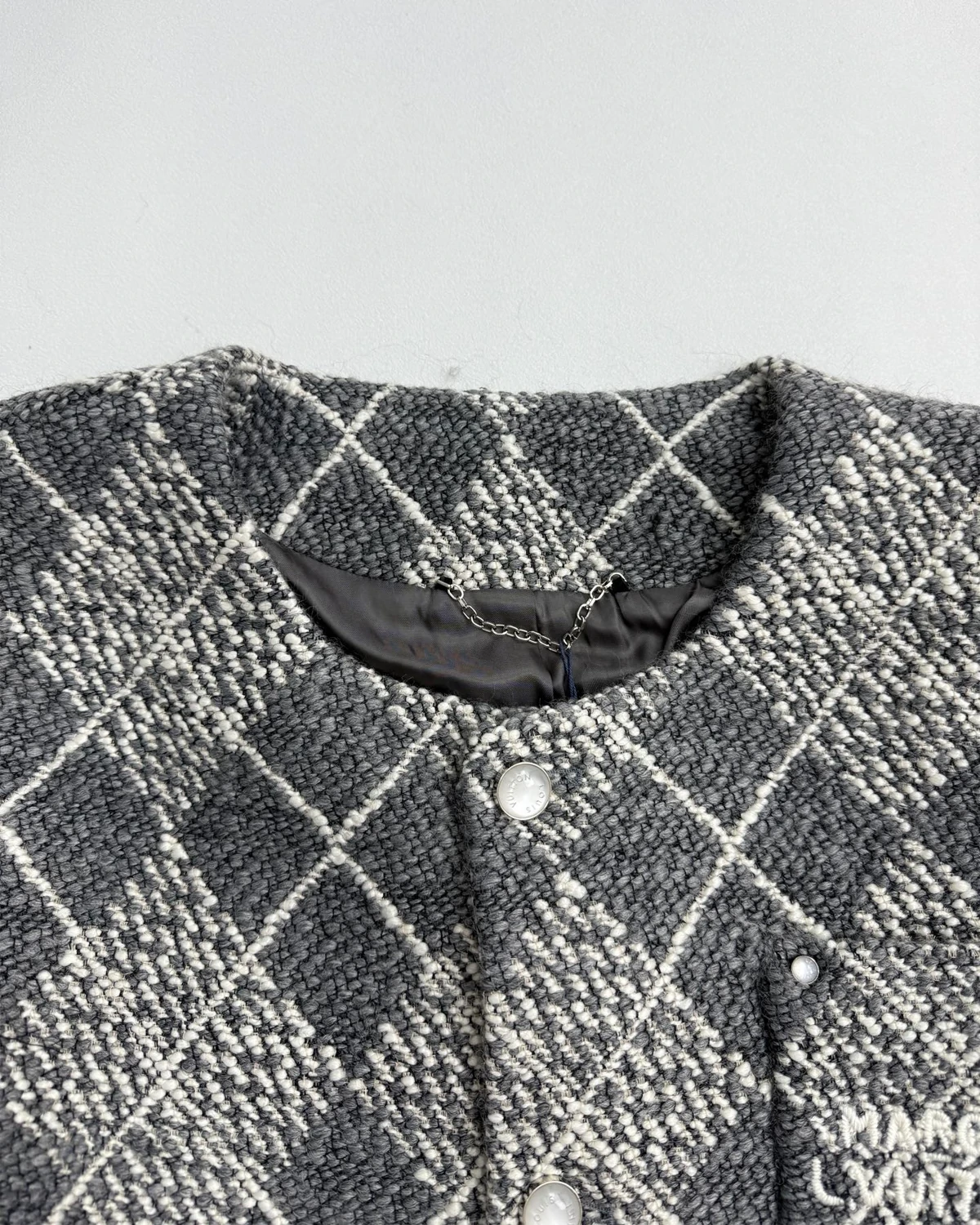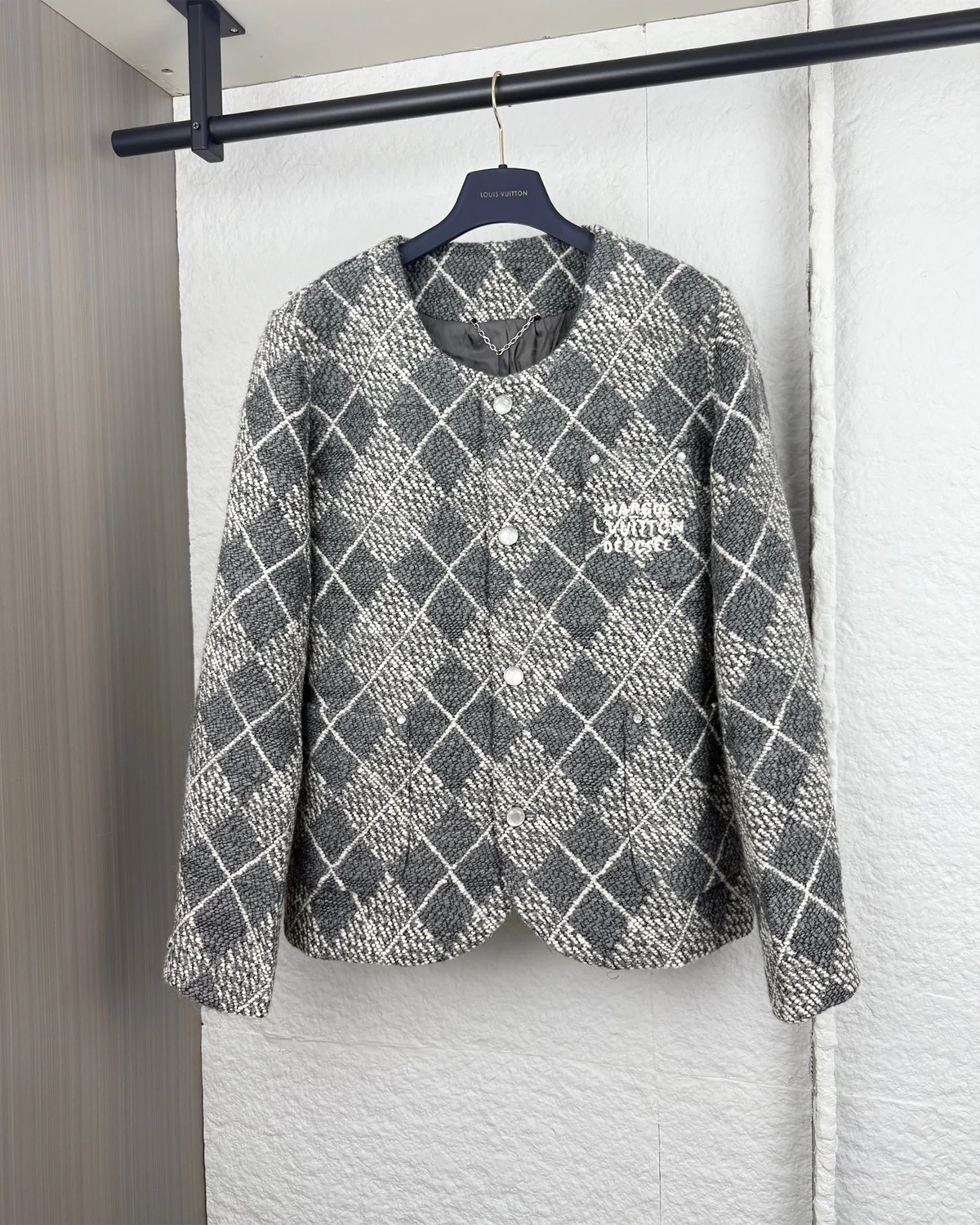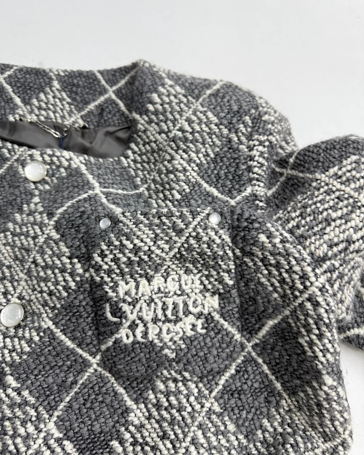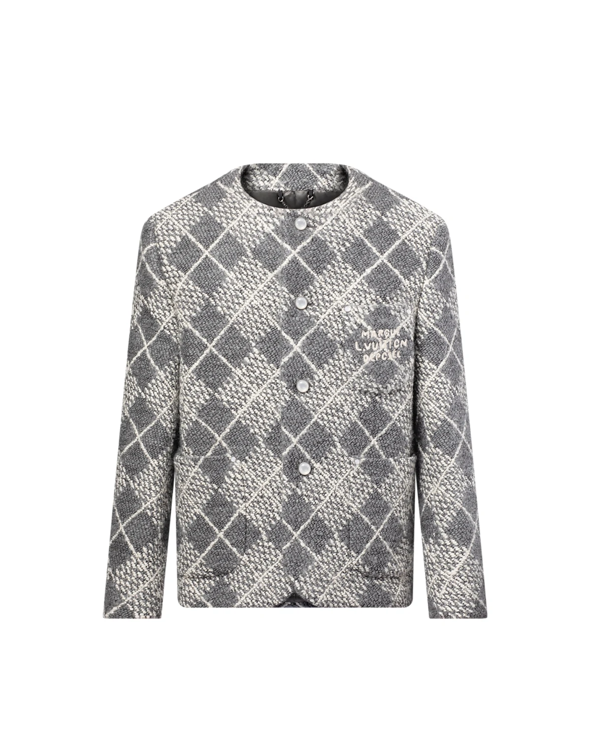 The jacket reinterprets the brand’s classic Damier pattern into a futuristic Argyle design, transforming the vibrant traditional motif into a grey jacquard beaded leather fabric, perfectly embellished with pearl-finish buttons and the Marque D??pos??e embroidered logo. This jacket can be mixed and matched for everyday looks, creating a modern and stylish effect.