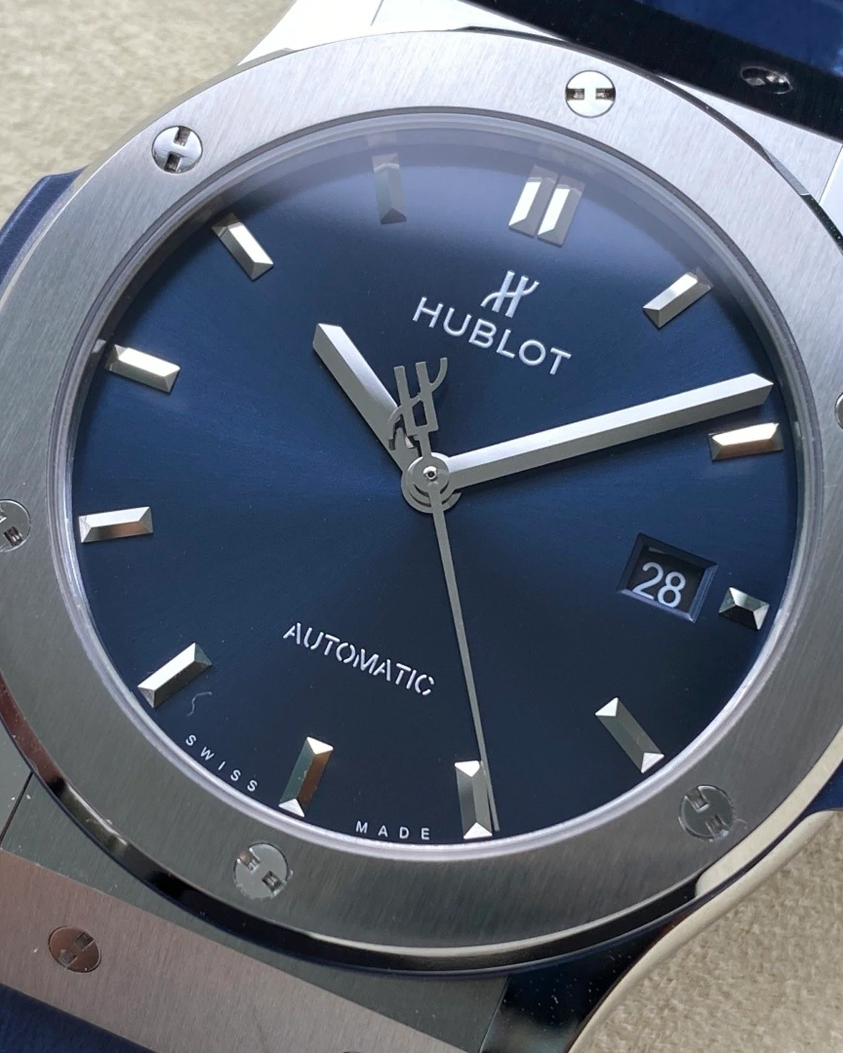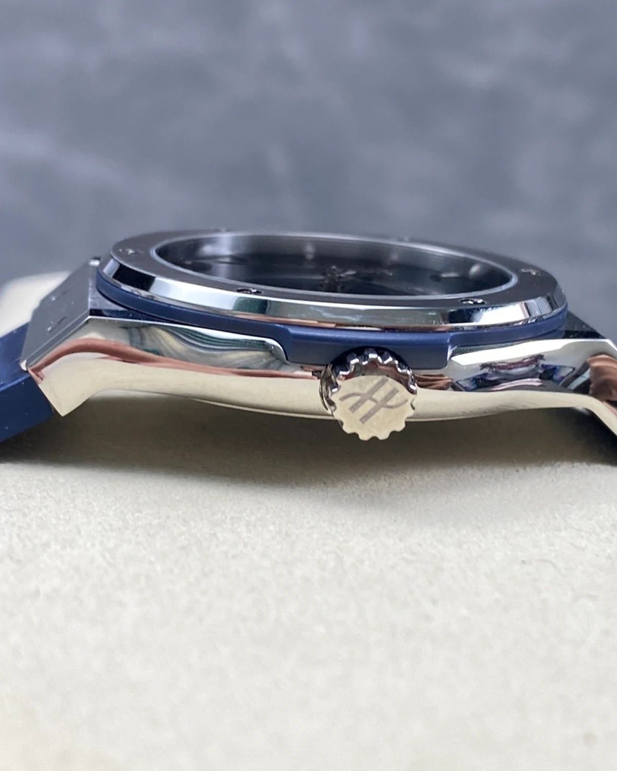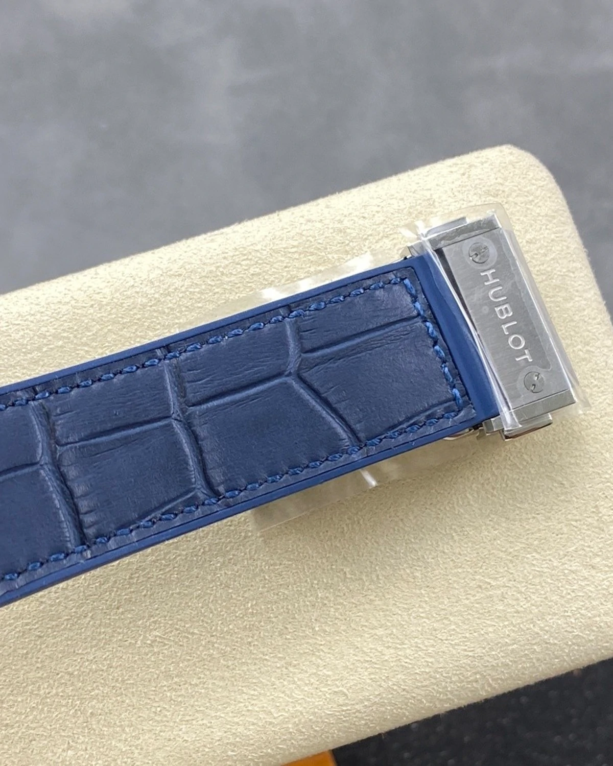 Features a polished and satin-finished titanium case with a blue sunray satin-finished dial, rhodium-plated hands and indexes, and sapphire crystal with anti-reflective coating. Powered by the HUB1112 self-winding movement with a 42-hour power reserve and date display at 3 o??clock. Fitted with a black rubber-lined blue alligator strap and stainless steel deployant clasp. Water resistant to 5 ATM.