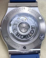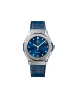 Features a polished and satin-finished titanium case with a blue sunray satin-finished dial, rhodium-plated hands and indexes, and sapphire crystal with anti-reflective coating. Powered by the HUB1112 self-winding movement with a 42-hour power reserve and date display at 3 o??clock. Fitted with a black rubber-lined blue alligator strap and stainless steel deployant clasp. Water resistant to 5 ATM.