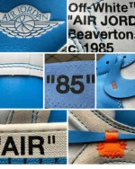 The bright blue contrasts sharply with the white mesh. It is the theme of deconstruction that makes this pair so attractive. Off-White x Jordan 1 University Blue ended with iconic straps and the classic Jumpman brand.