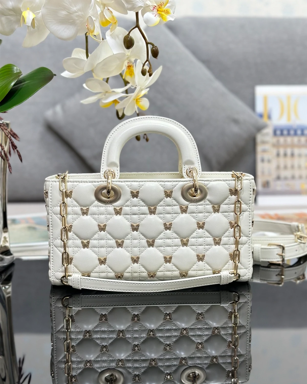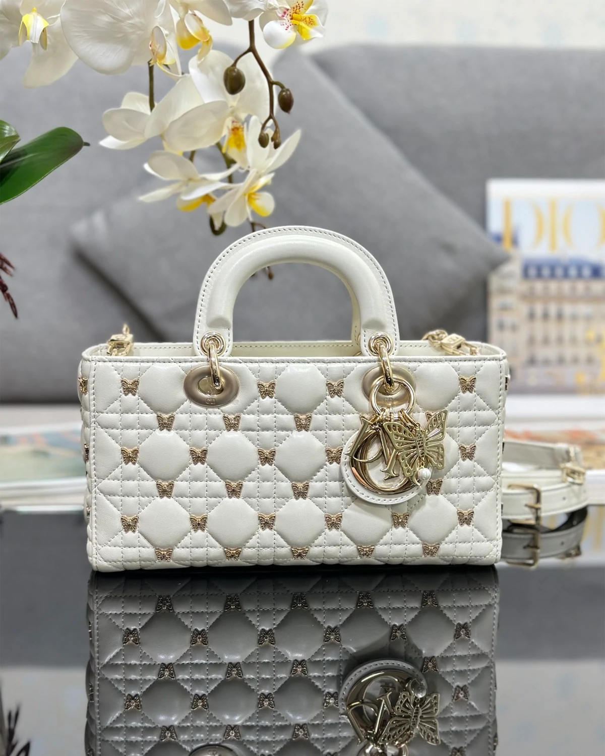 | Decorations | D.I.O.R. charm, pale gold-finish butterfly charm, white resin beads |