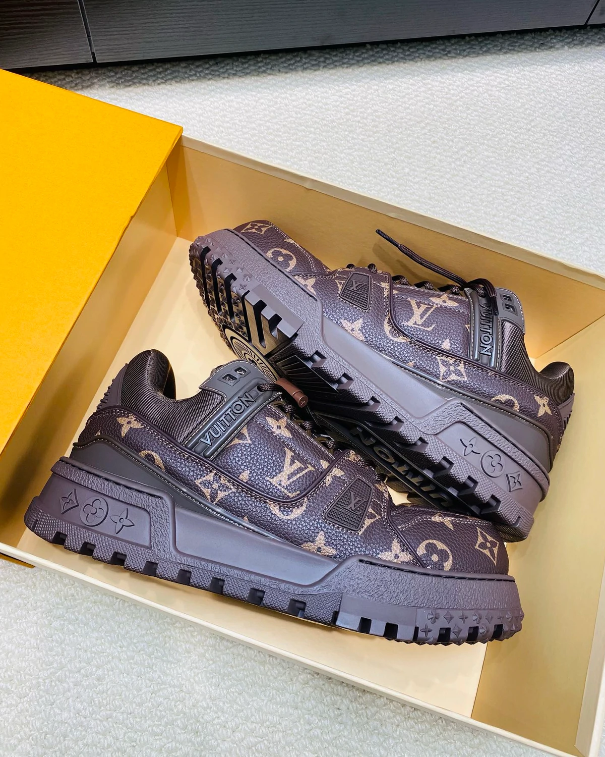 This LV Trainer Maxi sneaker is made of Monogram calfskin and recreates the classic Monogram canvas design. The design is inspired by the legendary LV Trainer sneakers created by Virgil Abloh and is renowned for its fashionable and avant-garde oversized version. The thick rubber sole is adorned with Monogram floral patterns, and the colors match the upper perfectly, creating an exquisite and complete look.