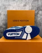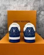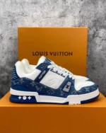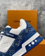 Designed by Louis Vuitton Artistic Director Virgil Abloh, the iconic LV Trainer sneaker is revisited this season in Monogram denim and Monogram-embossed grained calf leather. The contrasting colors and materials highlight the elaborate construction of this model, which was inspired by vintage basketball sneakers.