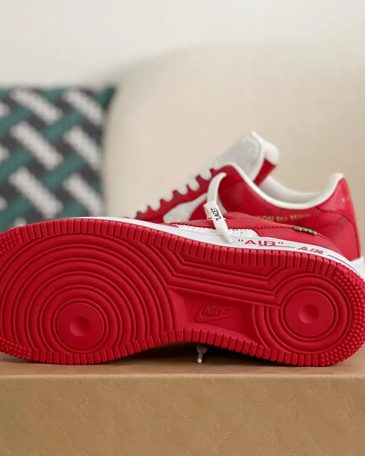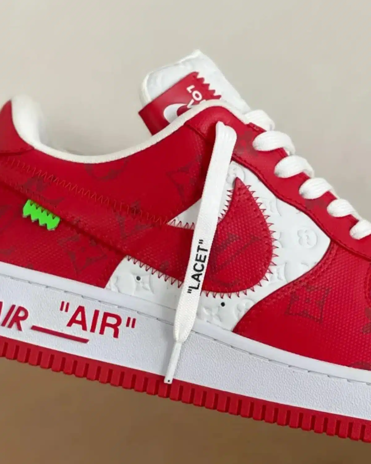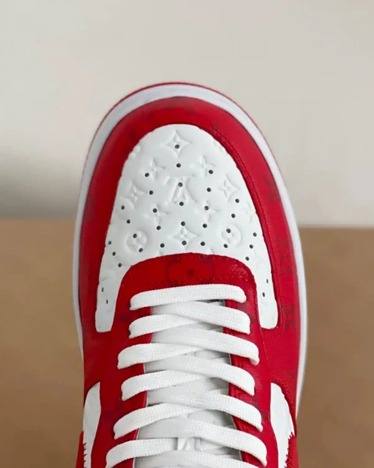The Louis Vuitton x Nike Air Force 1 Low ??White/Red?? is a rare luxury-streetwear fusion created under Virgil Abloh??s direction. Featuring a classic two-tone white and red design inspired by the original 1985 Nike Dunks, the sneaker is crafted with premium white leather embossed with LV??s monogram and overlaid with red textile bearing the same iconic pattern. Finishing touches include a green hangtag, signature ??AIR?? text on the midsole, and co-branding elements throughout.