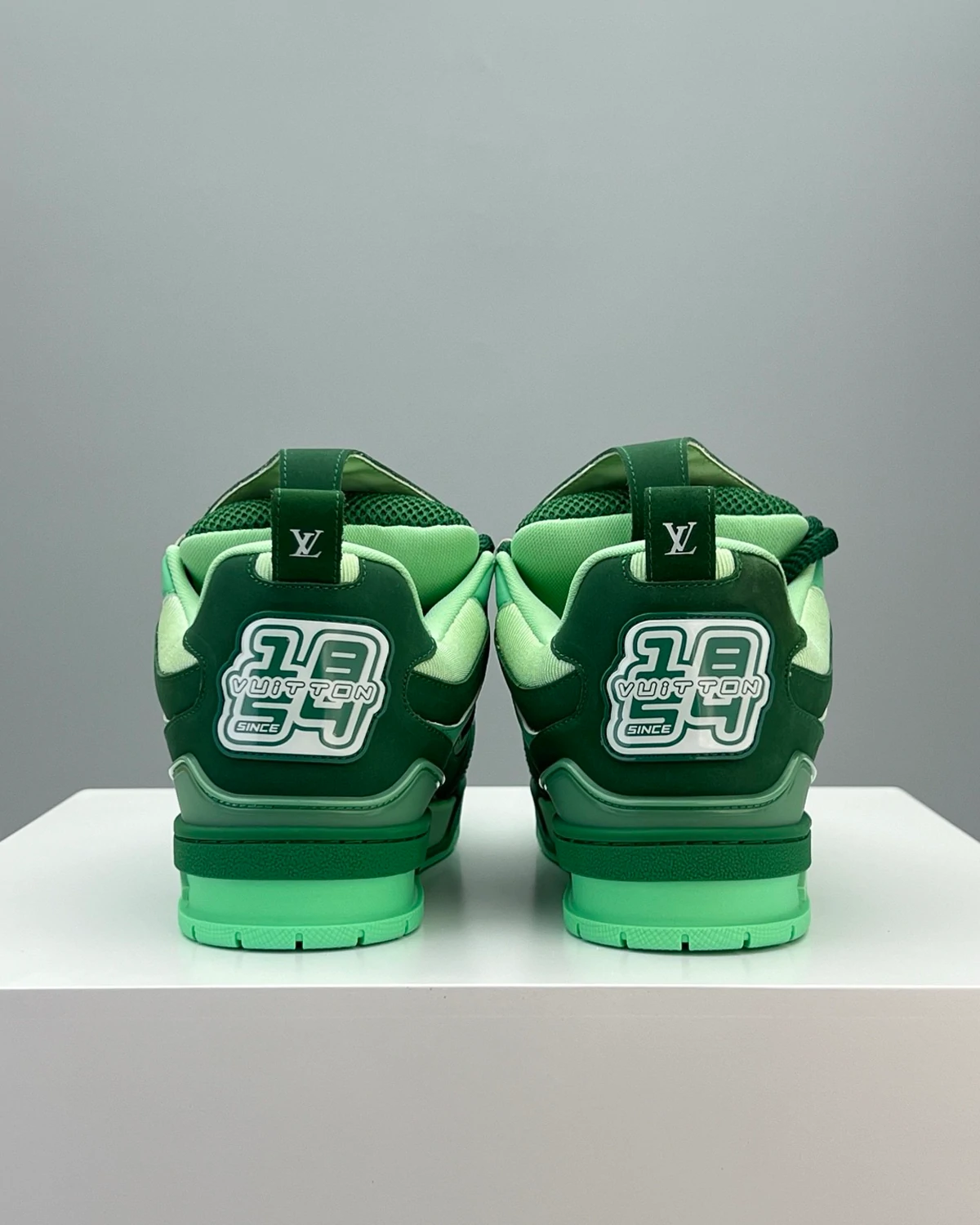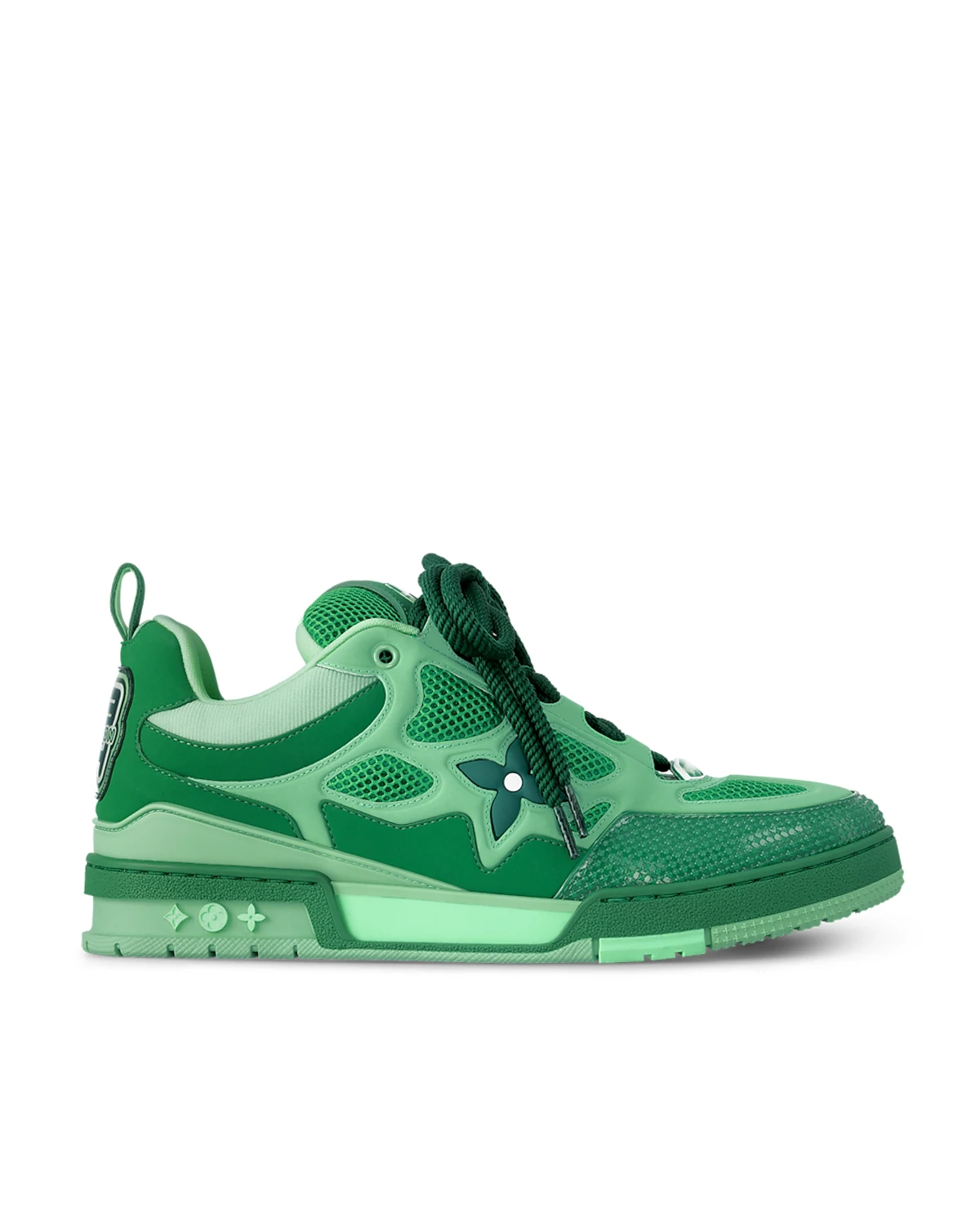 This colorblock version of the LV Skate sneaker comes in a mix of nubuck calf leather and technical mesh. Inspired by Nineties’ skate shoes, this model is notable for its thick double laces and exaggerated, padded collar and tongue. It has an oversized Monogram Flower on the side and an LV Vuitton logo on the tongue.
