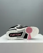This LV Skate sneaker combines multiple materials, features a black and white color scheme and is embellished with bright color elements. The design inspiration of this shoe model comes from the skate shoes of the 1990s, featuring thick cotton LACES, thickened cotton collar and tongue. The main details include the Monogram floral pattern on the side of the shoe and the LV Vuitton logo on the tongue.
