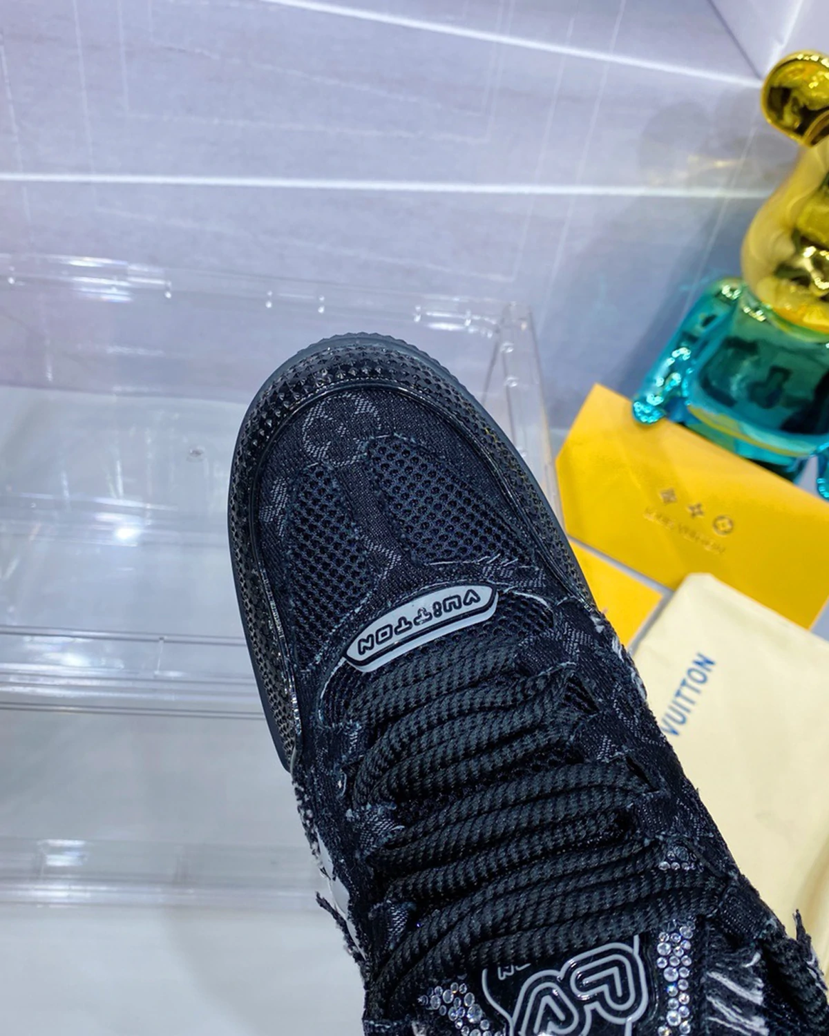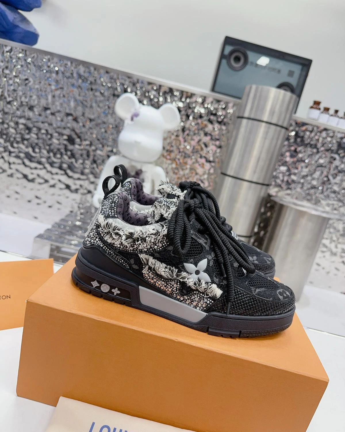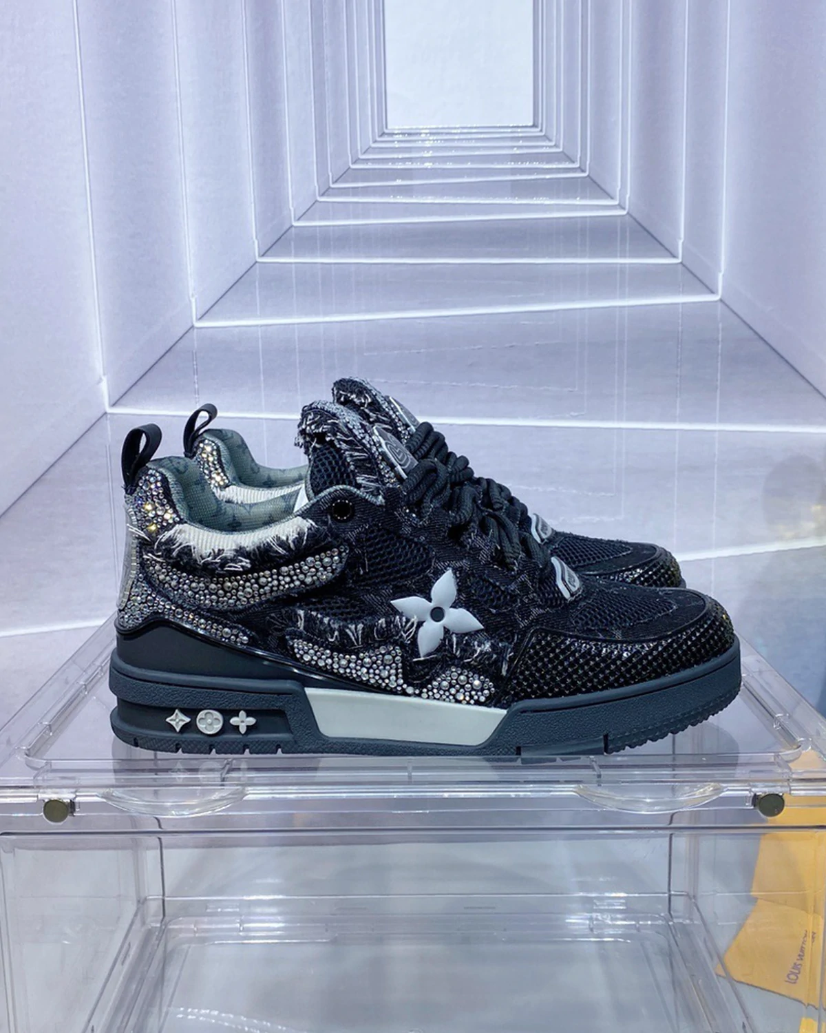 This limited edition LV Skate sneaker is made of Monogram denim, combined with shiny Swarovski? crystals and technical mesh. This design, inspired by the style of the 1990s, features a unique padded collar and tongue, adorned with the LV since 54 logo, symbolizing the founding of Louis Vuitton in 1854. The shoes are equipped with technical double-layer LACES and two-color rubber soles, making the design even more perfect.