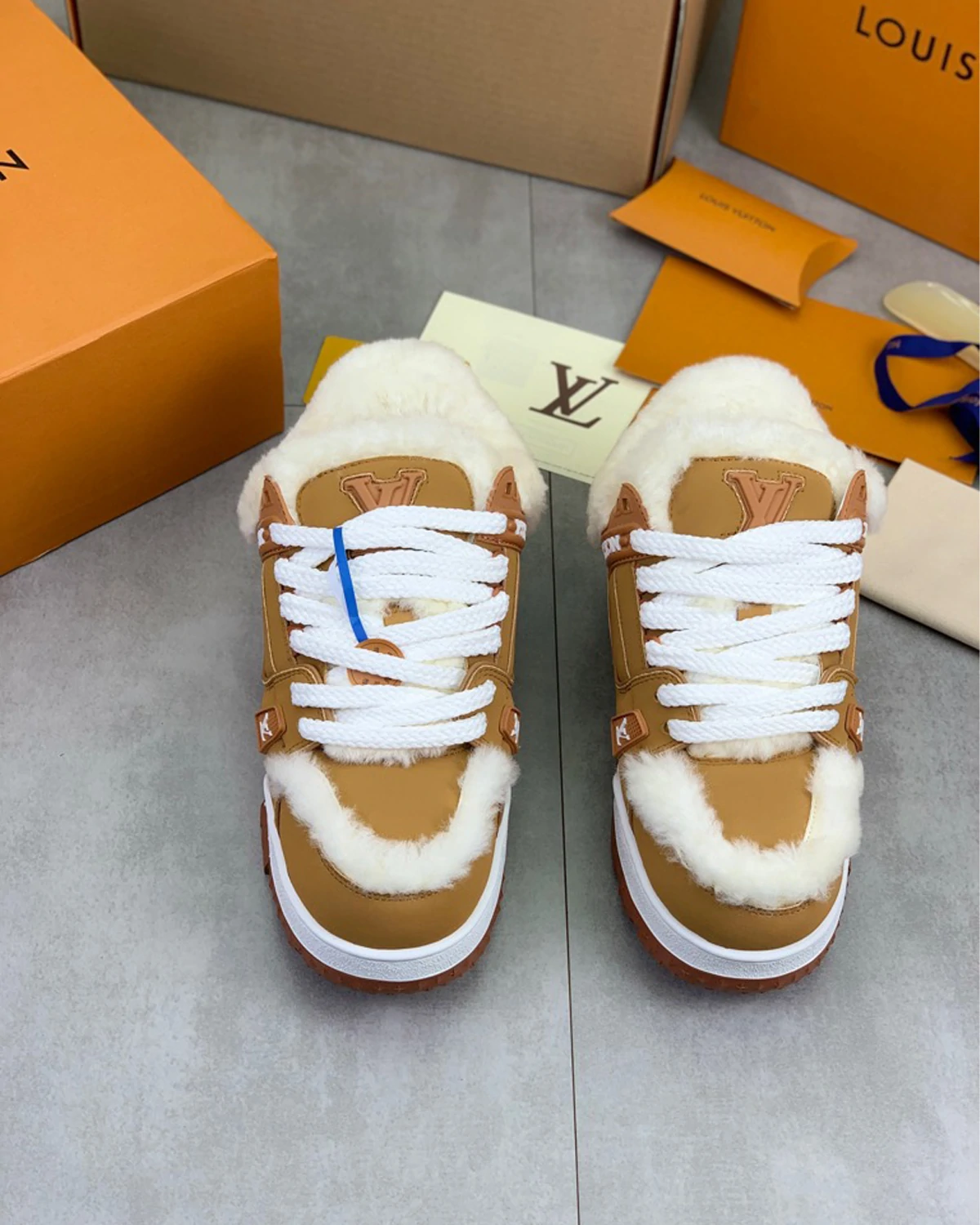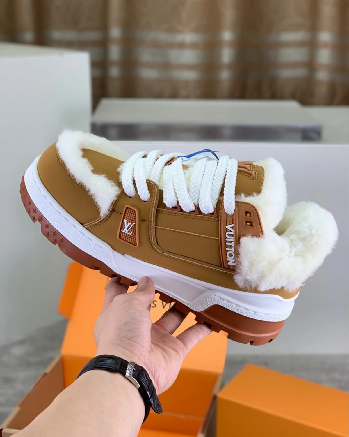 For the LV Ski capsule, the LV Trainer Maxi sneaker comes in nubuck leather, which is both trimmed and lined with soft, warm shearling.
