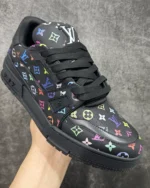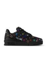 The iconic LV Trainer sneaker makes a fresh statement in grained calf leather featuring an allover print of a multicolored Monogram motif from the re-edition of the Louis Vuitton x Murakami collection, inspired by the artist??s exuberant aesthetic. Informed by vintage sporty styles, the upper is detailed with a cursive Louis Vuitton signature, while the back is printed with the number 54 in reference to 1854, the year the House was founded.
