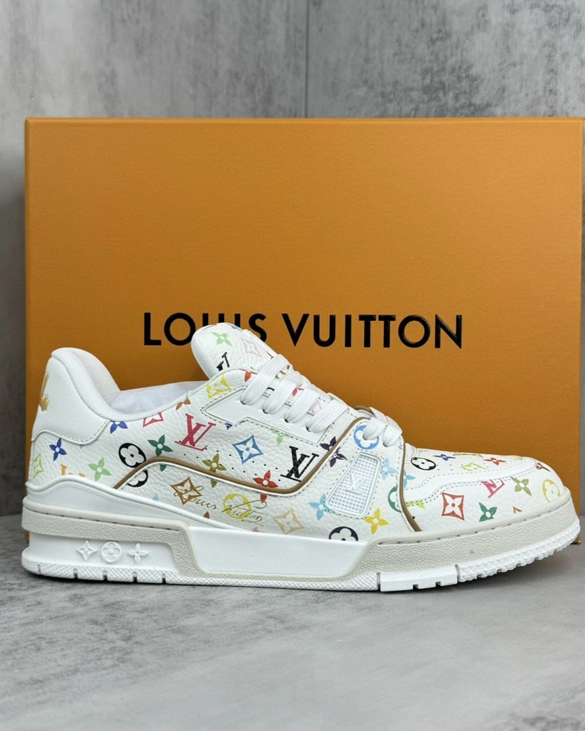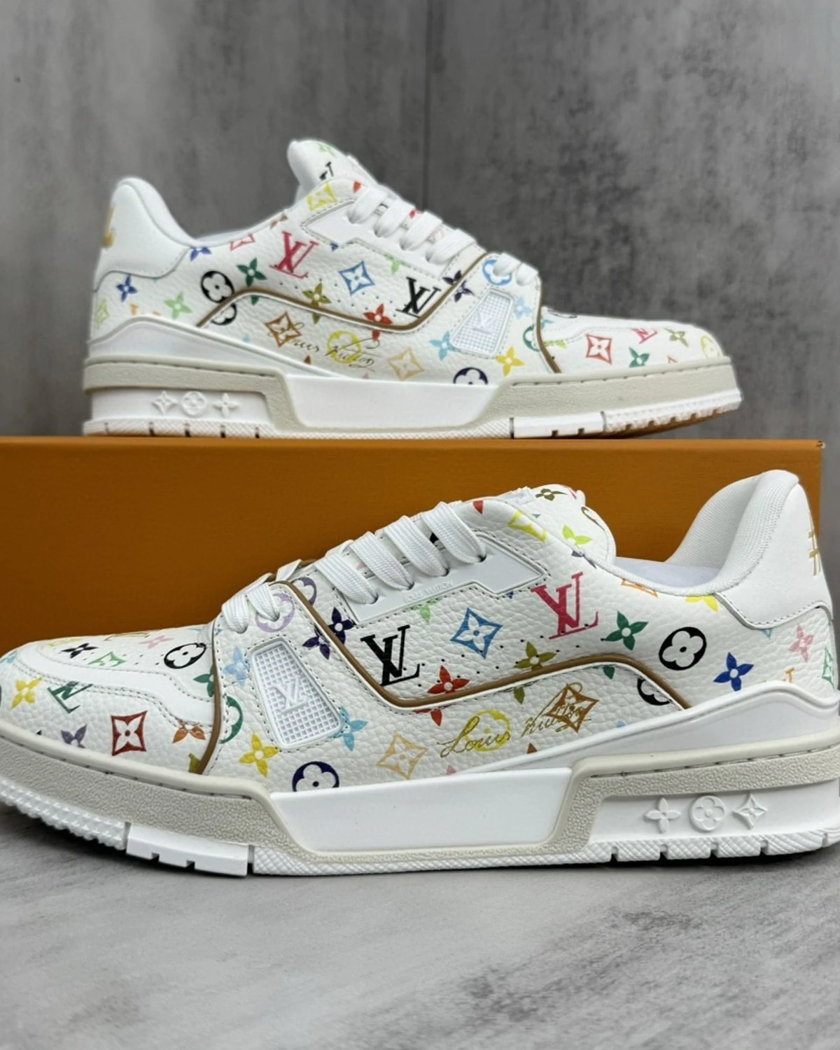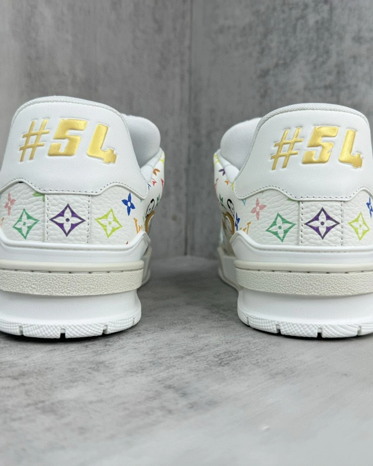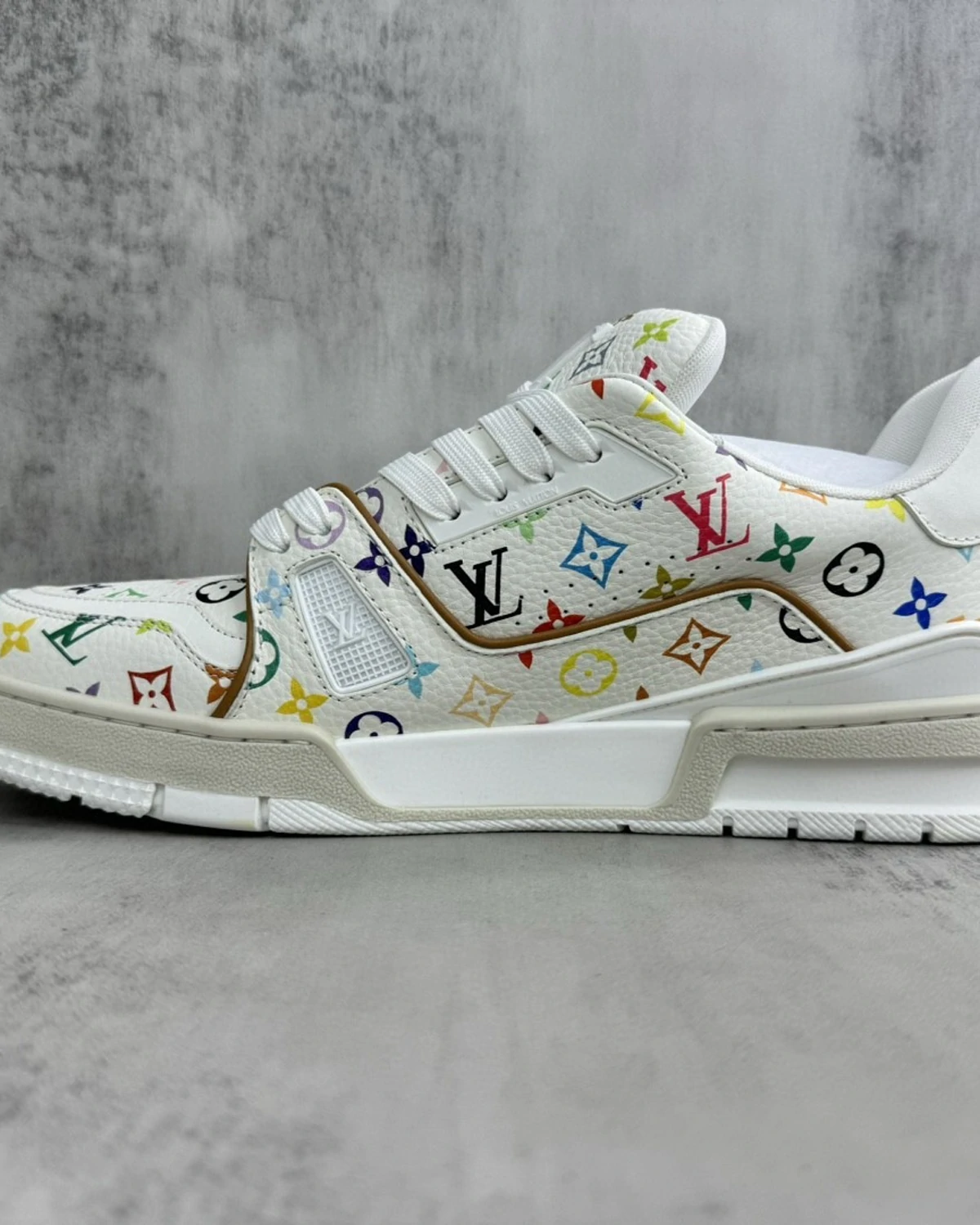 The iconic LV Trainer sneaker makes a fresh statement in grained calf leather featuring an allover print of a multicolored Monogram motif from the re-edition of the Louis Vuitton x Murakami collection, inspired by the artist??s exuberant aesthetic. Informed by vintage sporty styles, the upper is detailed with a cursive Louis Vuitton signature, while the back is printed with the number 54 in reference to 1854, the year the House was founded.