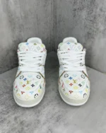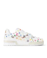 The iconic LV Trainer sneaker makes a fresh statement in grained calf leather featuring an allover print of a multicolored Monogram motif from the re-edition of the Louis Vuitton x Murakami collection, inspired by the artist??s exuberant aesthetic. Informed by vintage sporty styles, the upper is detailed with a cursive Louis Vuitton signature, while the back is printed with the number 54 in reference to 1854, the year the House was founded.