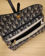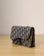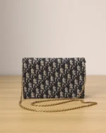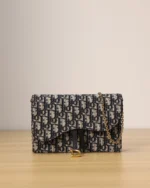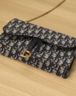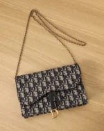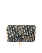The Saddle pouch with chain is a modern and practical creation with smooth and harmonious lines. Crafted in blue Dior Oblique jacquard, it features an asymmetric flap and an antique gold-finish metal D stirrup. The spacious interior will accommodate any essentials, while the chain allows it to be worn over the shoulder or crossbody. The medium pouch can be paired with other Saddle creations.