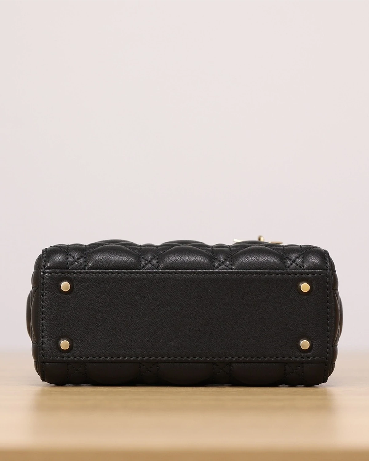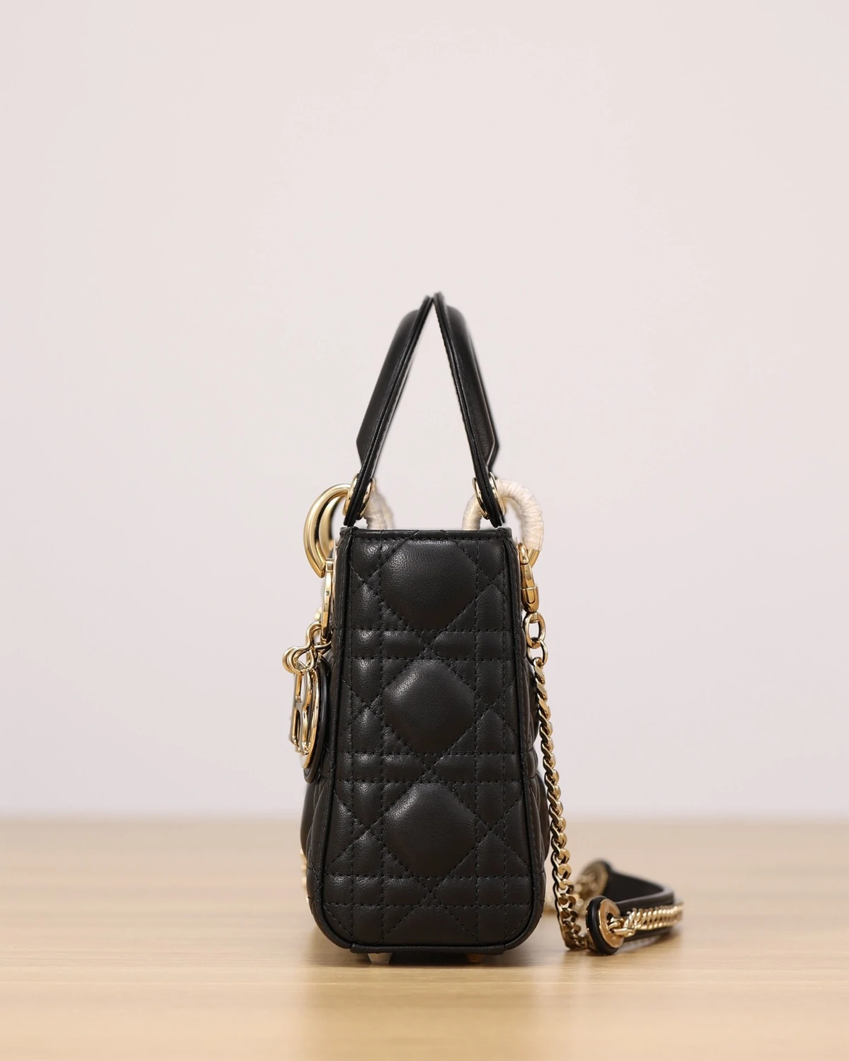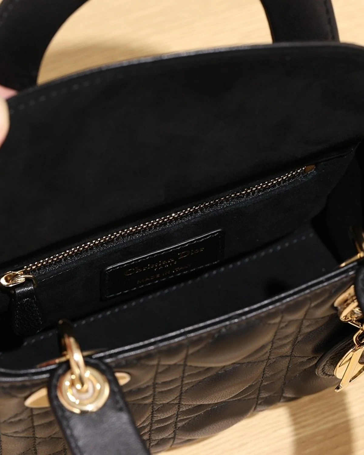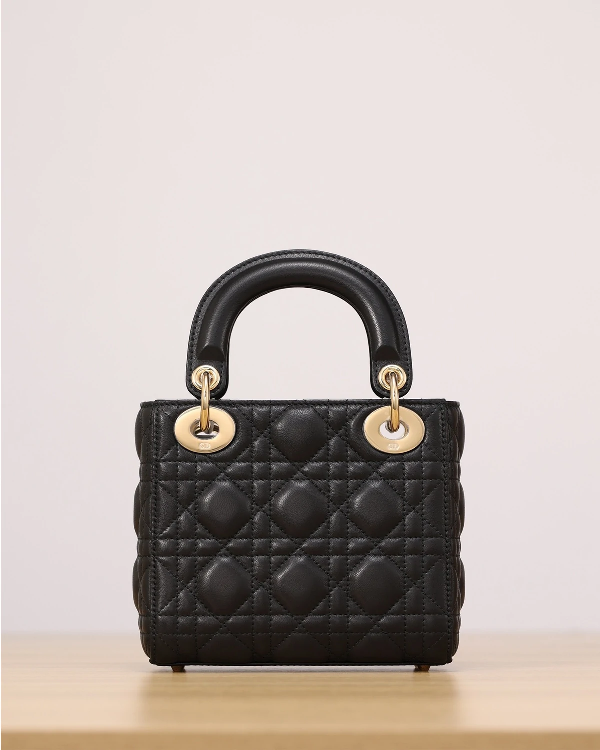 The Lady Dior bag epitomizes the House’s vision of elegance and beauty. Sleek and refined, the timeless style is crafted in black lambskin with Cannage stitching, creating the legendary and instantly recognizable quilted texture, while pale gold-finish metal D.I.O.R. charms further embellish its silhouette. Featuring a removable chain shoulder strap, the miniature Lady Dior bag can be carried by hand or worn crossbody as an ideal evening companion.