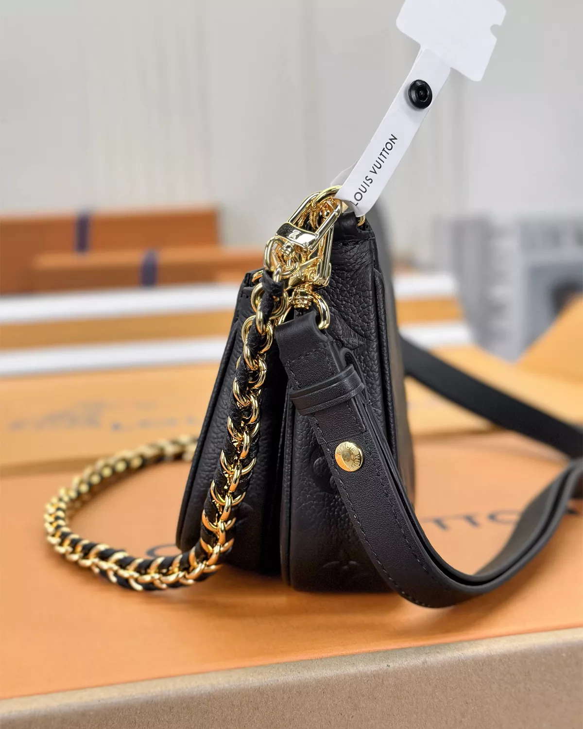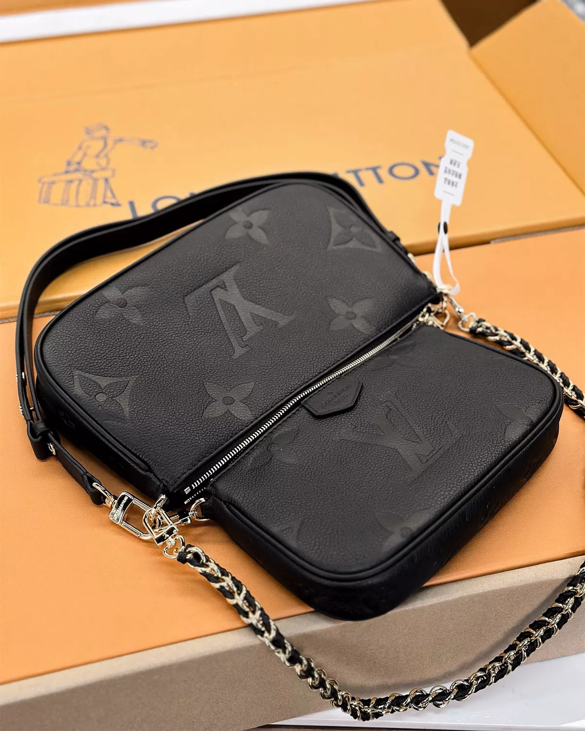 The rebce Multi Pochette Accessoires ??Black Monogram Empreinte?? redefines versatility with a two-in-one crossbody design. Crafted from supple embossed cowhide leather, it features a removable Large Pochette and Small Pochette, giving you multiple styling options for day to night. Accented with gold-tone hardware, a removable chain, and an adjustable leather strap, this bag combines elegance with functionality. Spacious enough to hold your smartphone, card holder, keys, and lipstick, it??s the perfect companion for modern lifestyles that require both style and practicality.