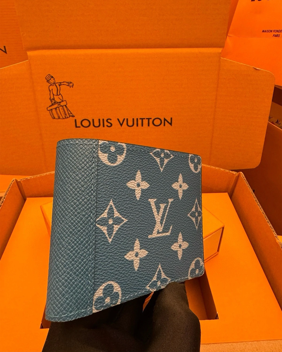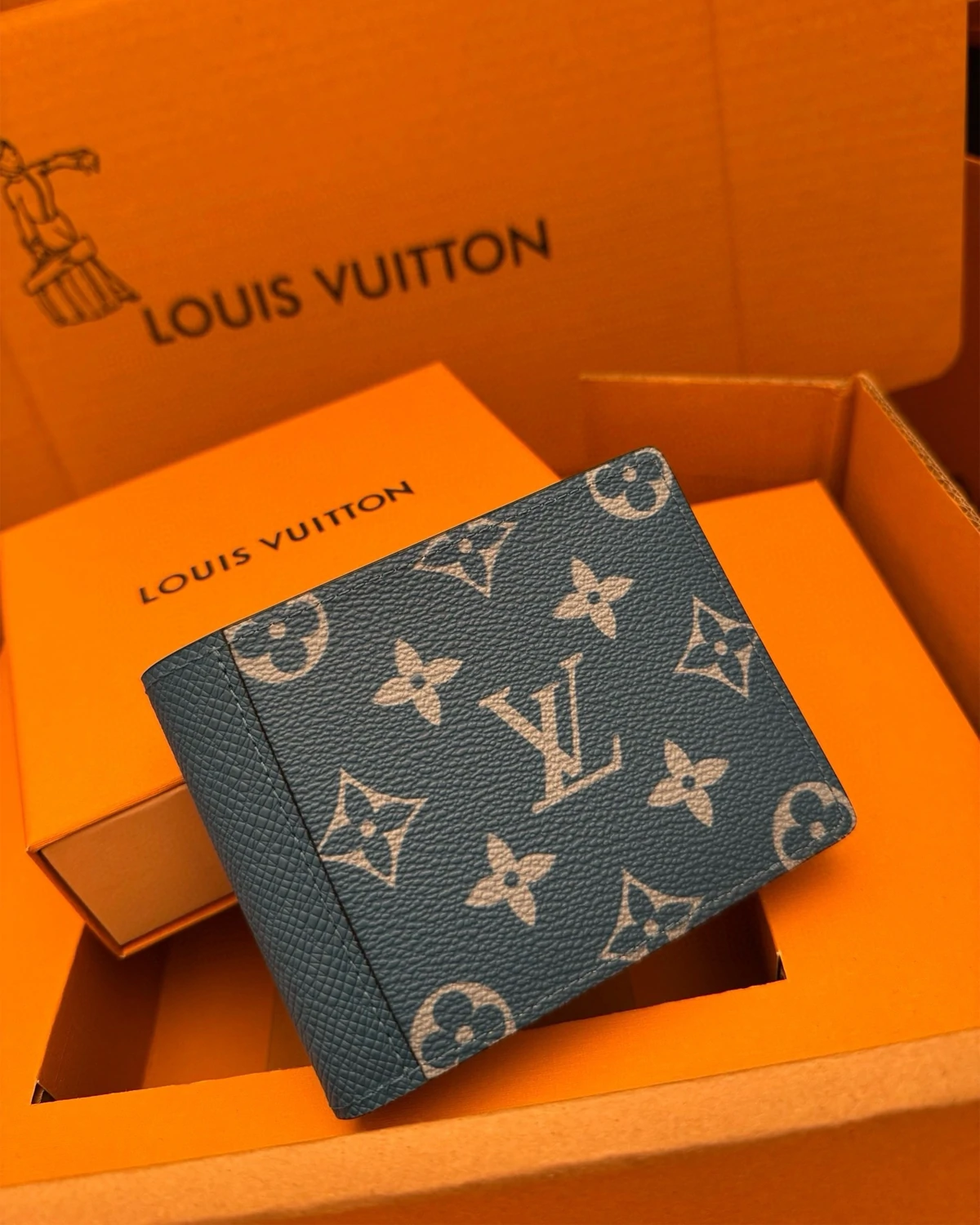 A tone-on-tone combination of Monogram canvas and Taiga leather in a crisp colorway give this compact Multiple Wallet a sporty aspect. Lined in cowhide, the interior includes three card slots, two inside pockets, two compartments for bills, and two side slots. The Multiple fits into most pockets.
