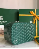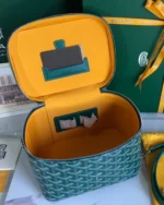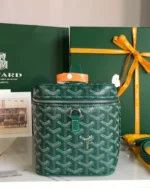 This is an authentic?GOYARD Goyardine Muse Vanity Case in Black. This stylish messenger bag is crafted of classic Goyard monogram chevron canvas. The bag features black leather trim, a matching flat top handle, and polished silver hardware. The 3/4 top zipper opens to a mango fabric interior with an elastic pocket, elastic bands, and a removable mirror slot on the top.