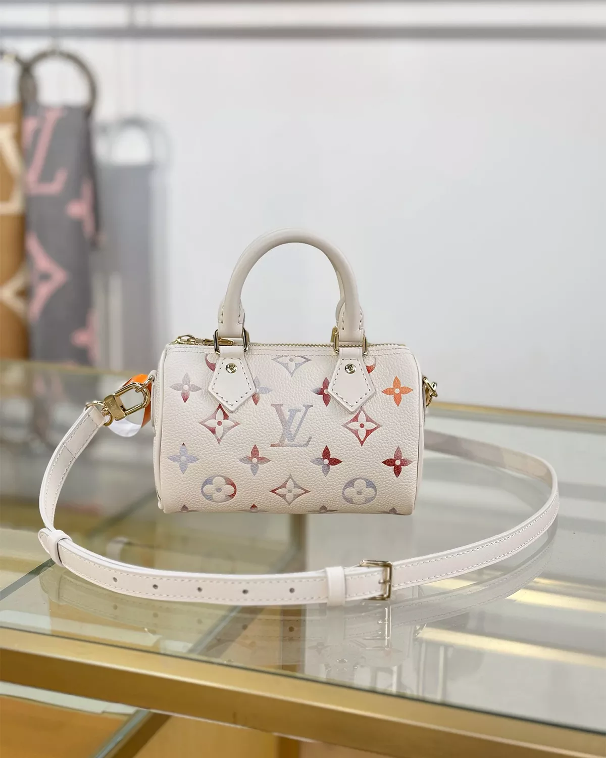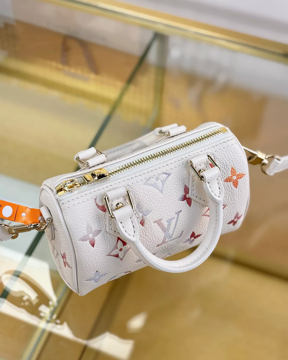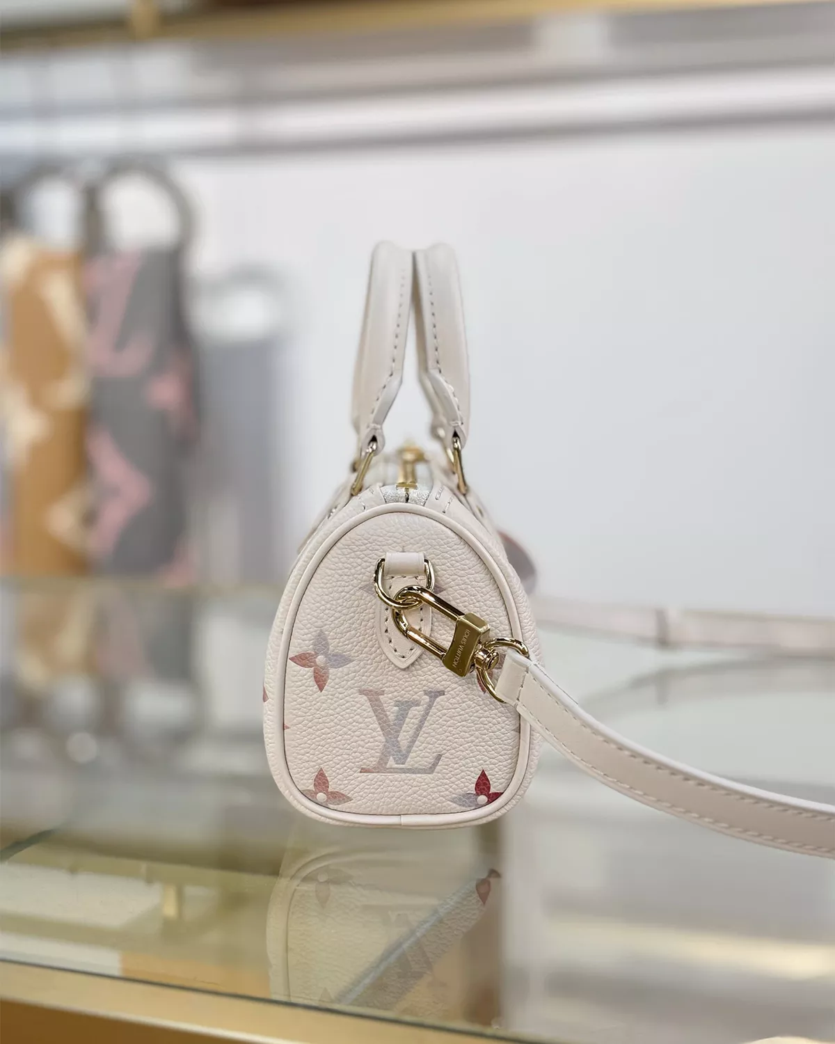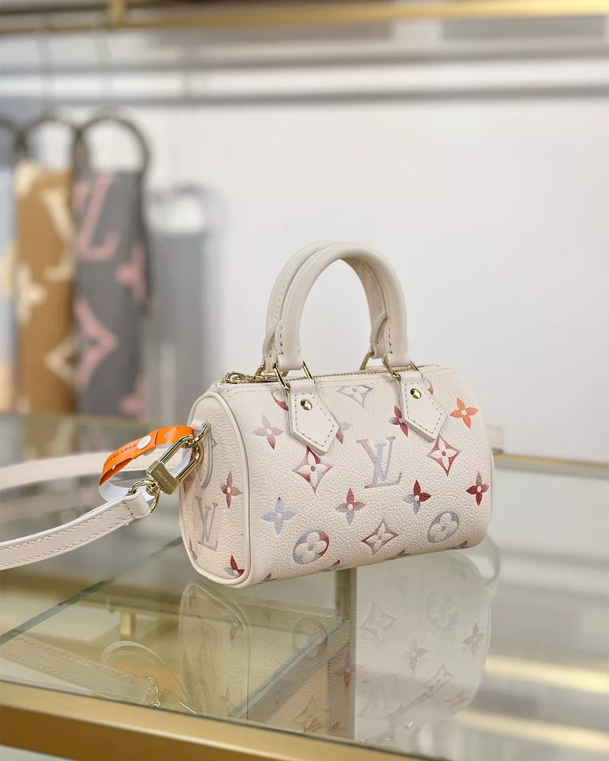 The Nano Speedy ??Dream Beige?? is a refined mini bag that elevates everyday style with timeless elegance. Crafted from embossed grained cowhide leather in a neutral Dream Beige tone, it??s accented with light gold-toned hardware for a sophisticated finish.