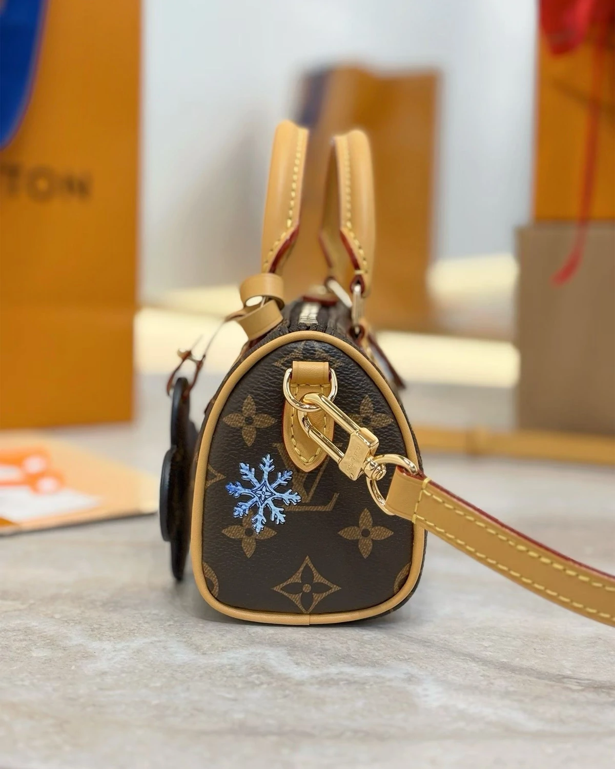 This colorful edition of the Nano Speedy stars the House??s iconic mascot Vivienne. Crafted from signature Monogram canvas, the playful design is decorated with illustrations and includes a Vivienne charm. It is trimmed with leather and is finished with gold-toned hardware for a sophisticated finishing touch.