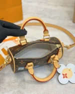 This colorful edition of the Nano Speedy stars the House??s iconic mascot Vivienne. Crafted from signature Monogram canvas, the playful design is decorated with illustrations and includes a Vivienne charm. It is trimmed with leather and is finished with gold-toned hardware for a sophisticated finishing touch.