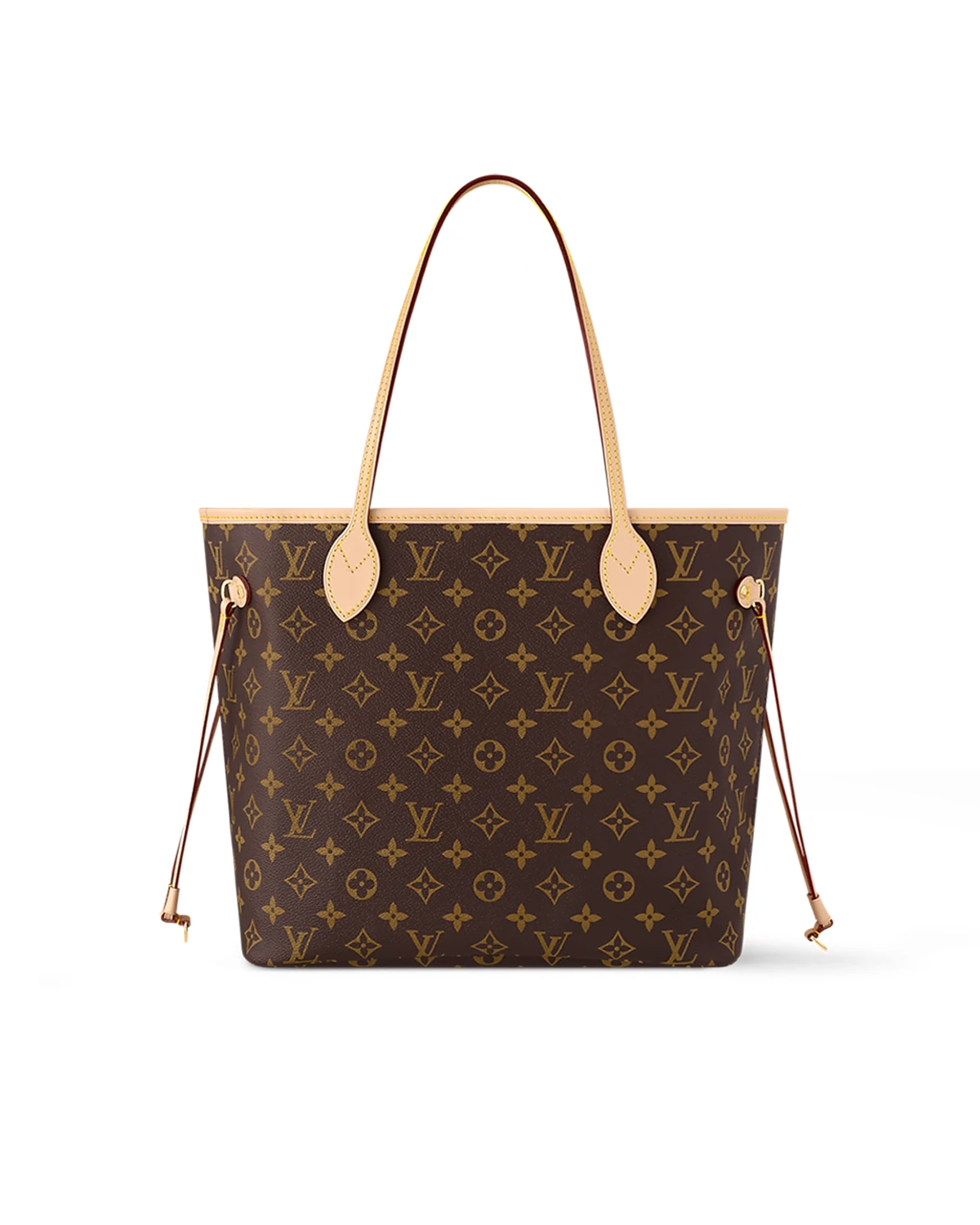 The Neverfull MM tote unites timeless design with heritage details. Made from supple Monogram canvas with natural cowhide trim, it is roomy yet not bulky, with side laces that cinch for a sleek allure or loosen for a casual look. Slim, comfortable handles slip easily over the shoulder or arm. Lined in colorful textile, it features a removable pouch which can be used as a clutch or an extra pocket.