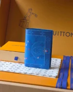 This Passport Cover in deep blue Monogram canvas features a whimsical aerial scene of players on a basketball court. Designed to bring personality to travel, it securely holds a passport and includes four card slots and a flat pocket ?C balancing playful design with practical function in a spirited, expressive accessory.