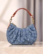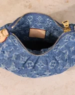 The Pochette Valley handbag is reimagined in Monogram Denim, offering a contemporary take on the classic design. It is made from organic cotton, trimmed with cowhide leather in a contrasting neutral tone that complements the gold-toned hardware. The handle is removable so it can be carried as a pochette, just as its name suggests.