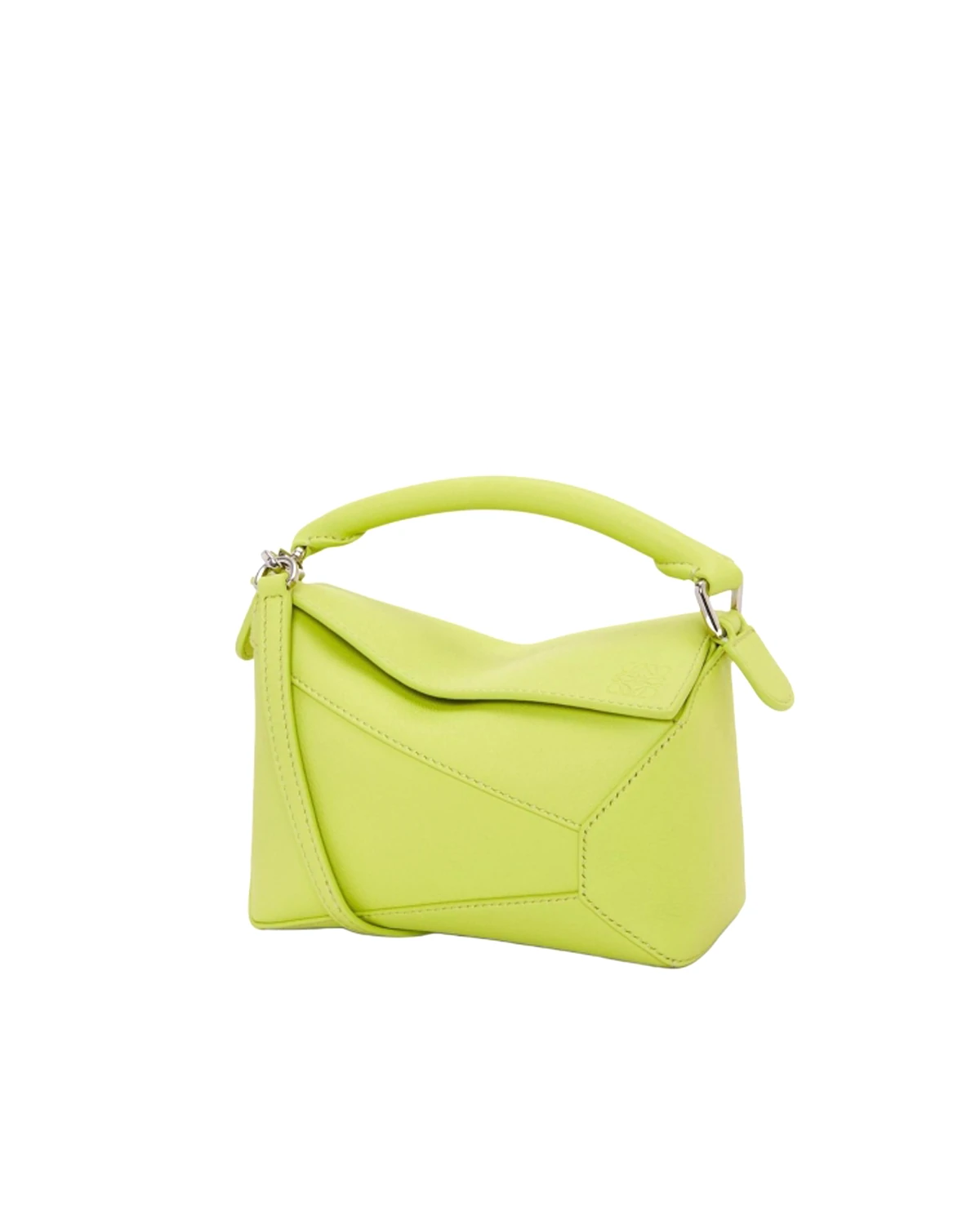 Puzzle Mini bag in fluorescent green, crafted from calfskin with geometric design, compact and versatile with adjustable strap.