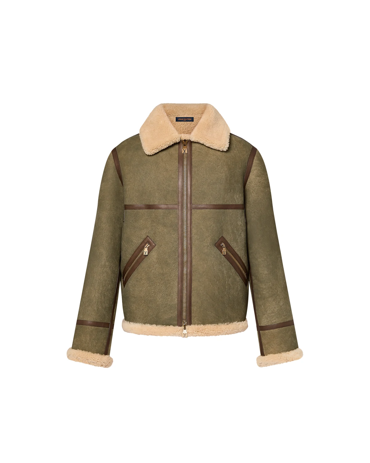 This cozy shearling bombardier is elevated with an LV Vers signature from the SS24 Show which is applied in studs across the back. Perfect for winter, this timeless menswear essential has a soft wool lining and collar and is embellished with a delicate marbled effect on the Khaki suede exterior, while contrasting leather bands add a smart finishing touch.