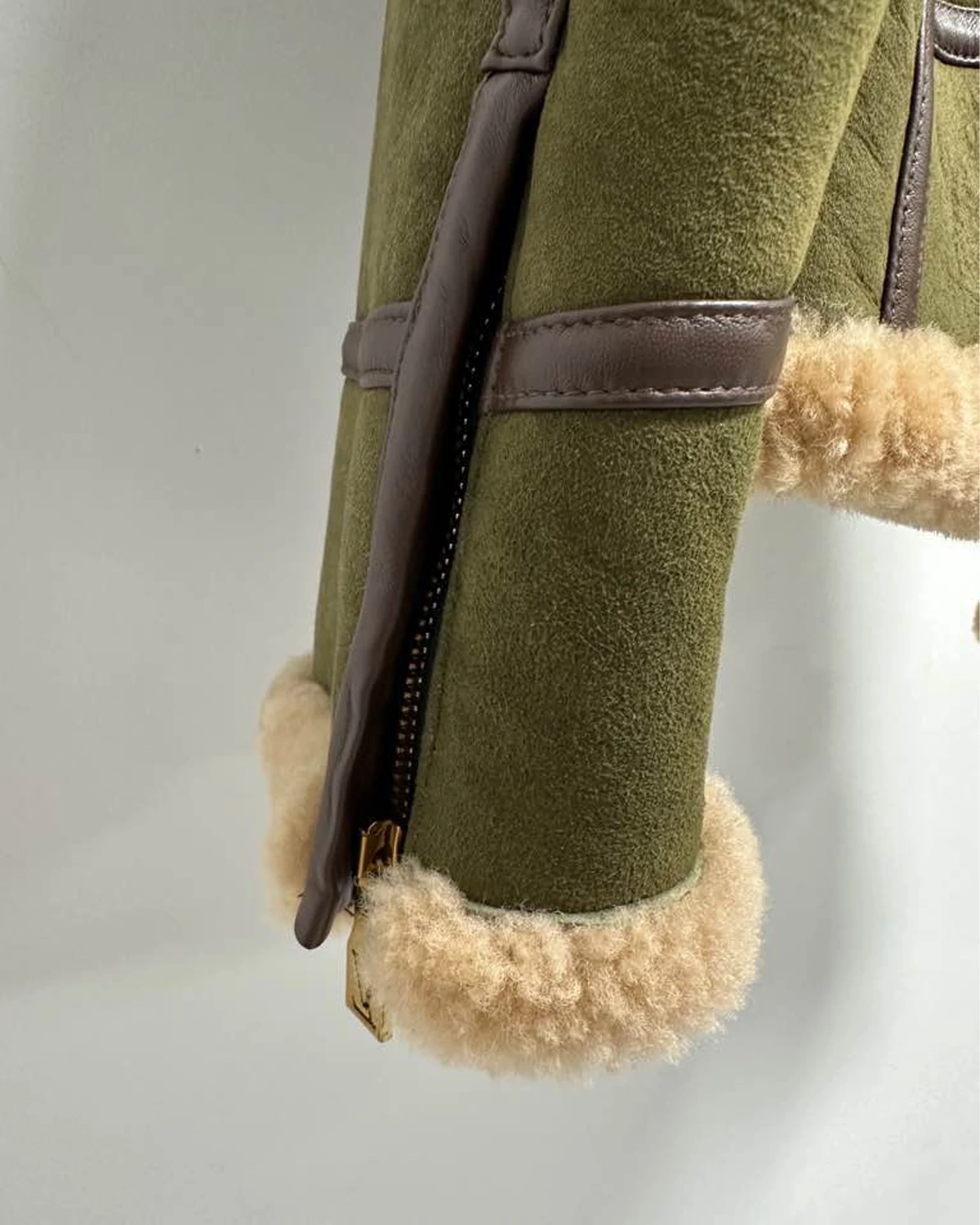 - Shearling collar, lining, cuffs and bottom hem