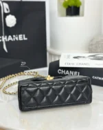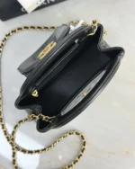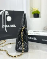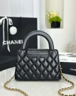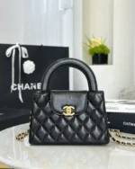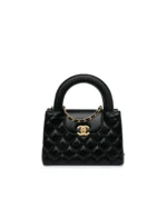 This is a Nano Kelly Shopper in shiny, distressed calfskin quilted leather, black. This double-handled bag is crafted from quilted shiny, distressed black calfskin and detailed with distressed gold hardware. The flap fastens with a CC turn-lock closure. The flap opens to a compact black leather interior with a zipper and flat pockets.