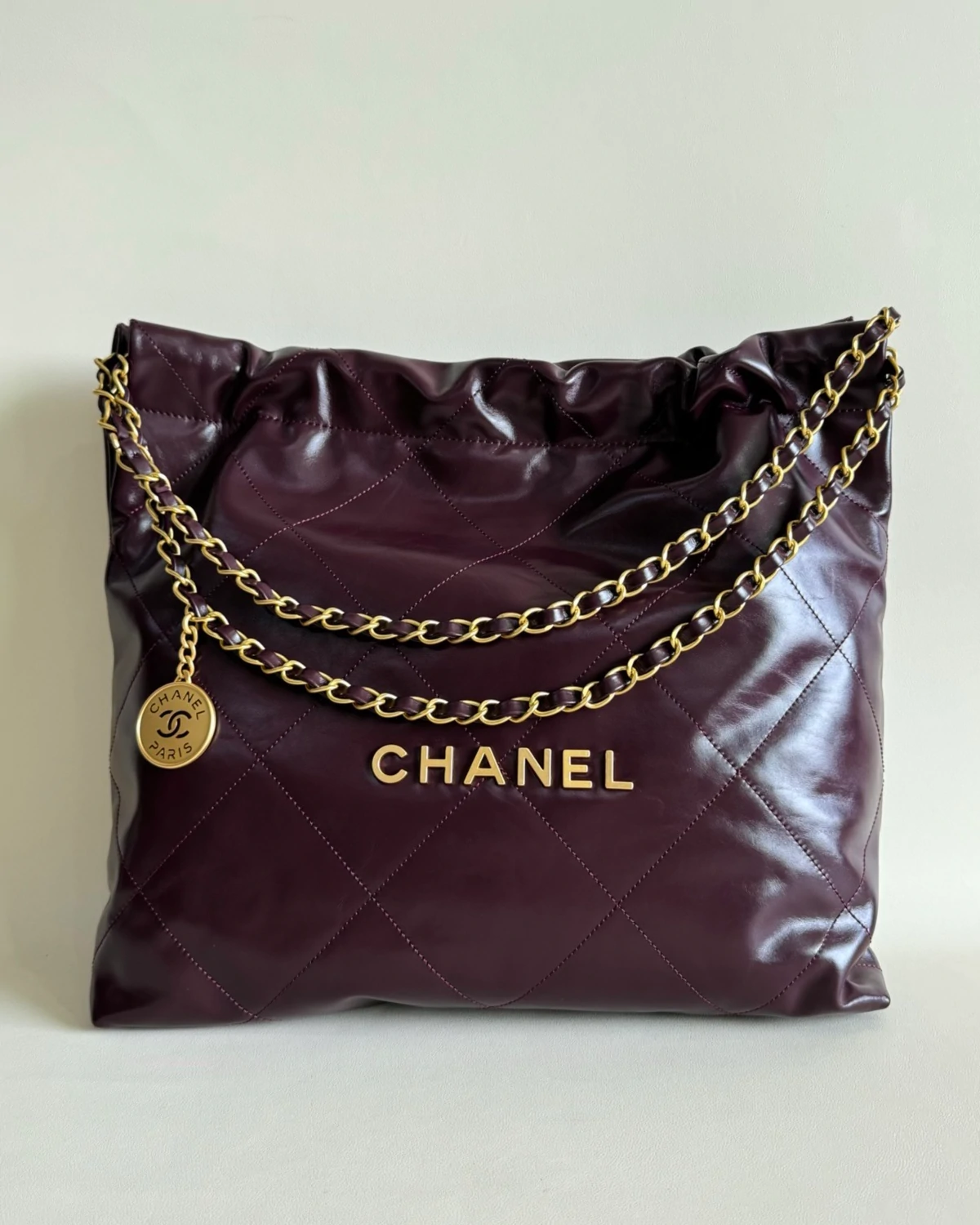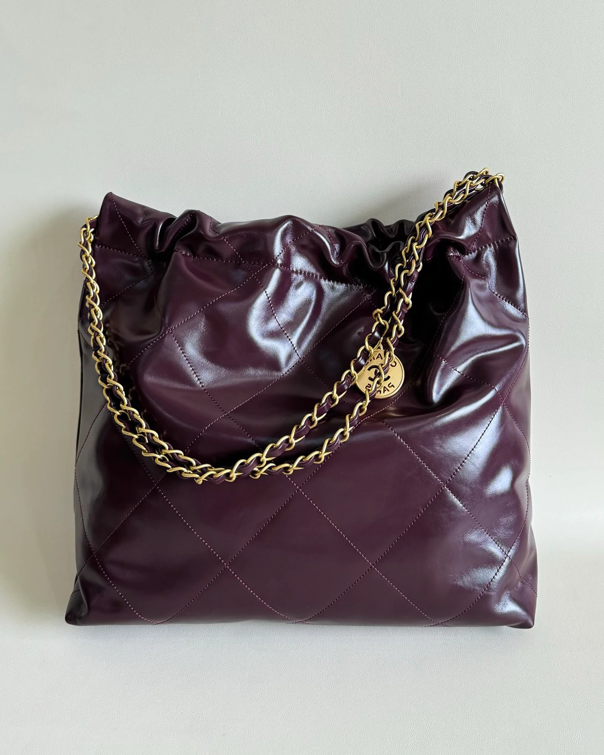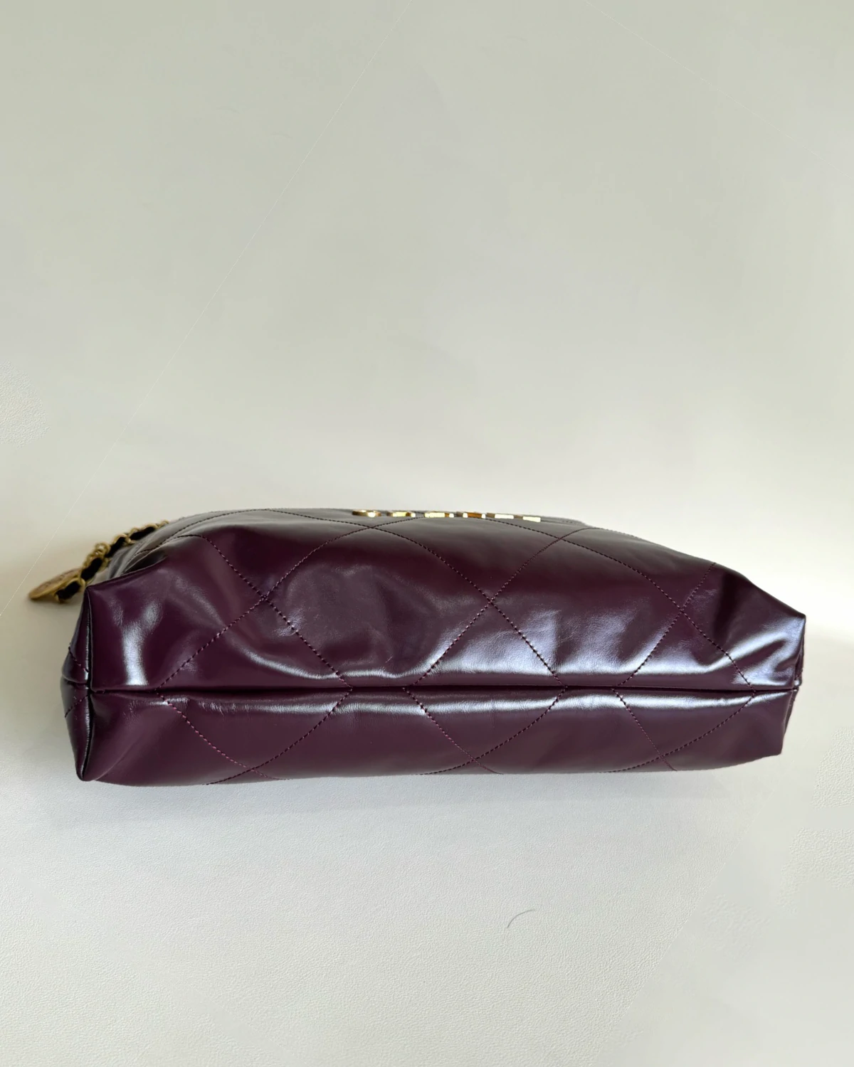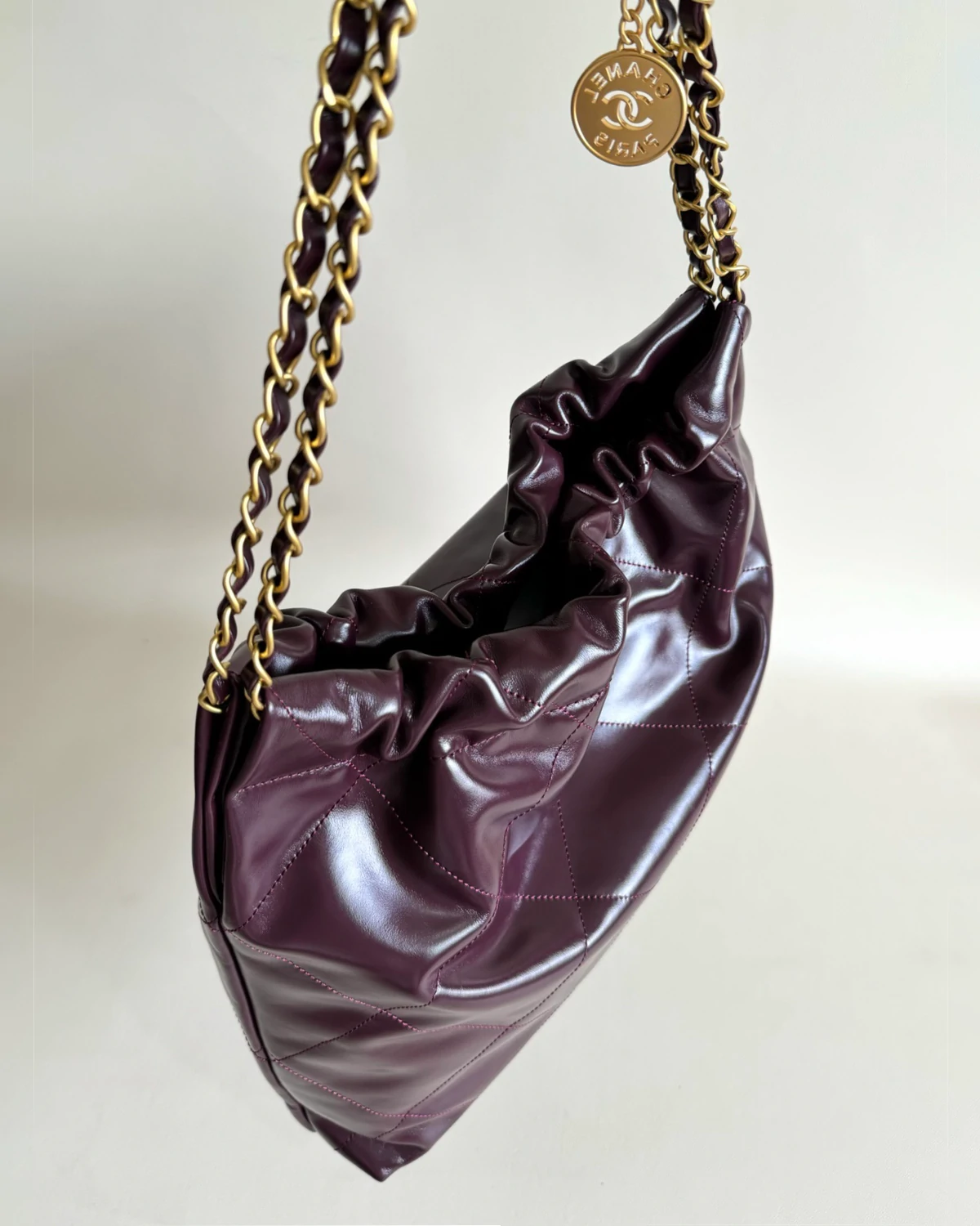 Made of calfskin, this spacious, flat, diamond-quilted half-moon bag features an antique gold-tone nameplate on the front! The drawstring top has a magnetic closure, revealing a tonal fabric lining when opened. The interior includes a zip pocket and a detachable zip pocket. A double leather chain shoulder strap with a decorative logo embellishment stands 9 inches tall and can be carried by hand or over the shoulder. Comes with a dust bag and box.