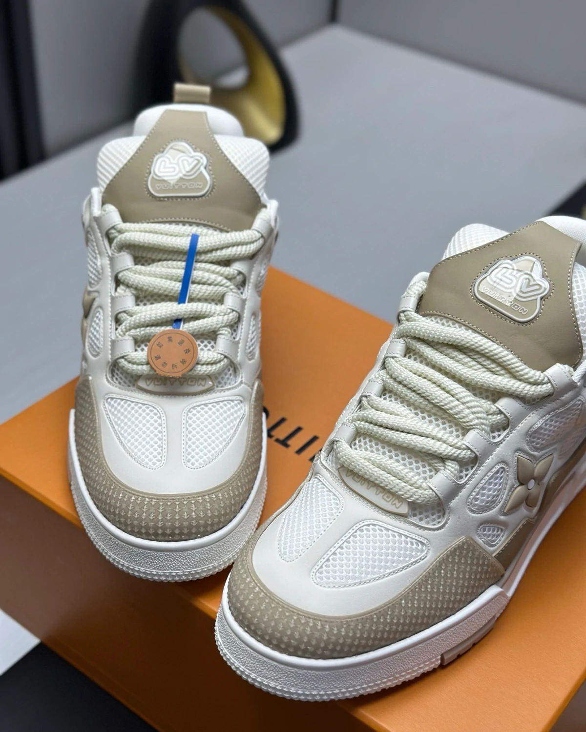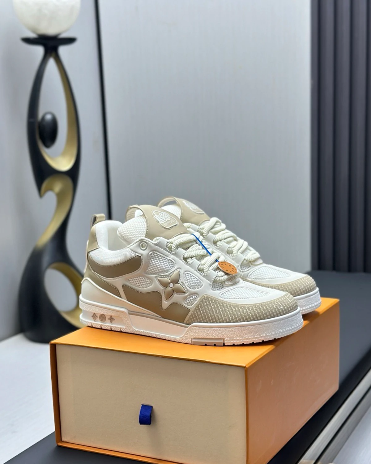 The LV Skate sneaker references a Nineties-inspired design first seen at Louis Vuitton’s Fall-Winter 2022 men’s show. Its elaborate, bicolor upper with Monogram Flower detailing combines technical mesh, calf leather and suede. This model is notable for its padded collar, technical double laces and bicolor rubber outsole decorated with Monogram Flowers.