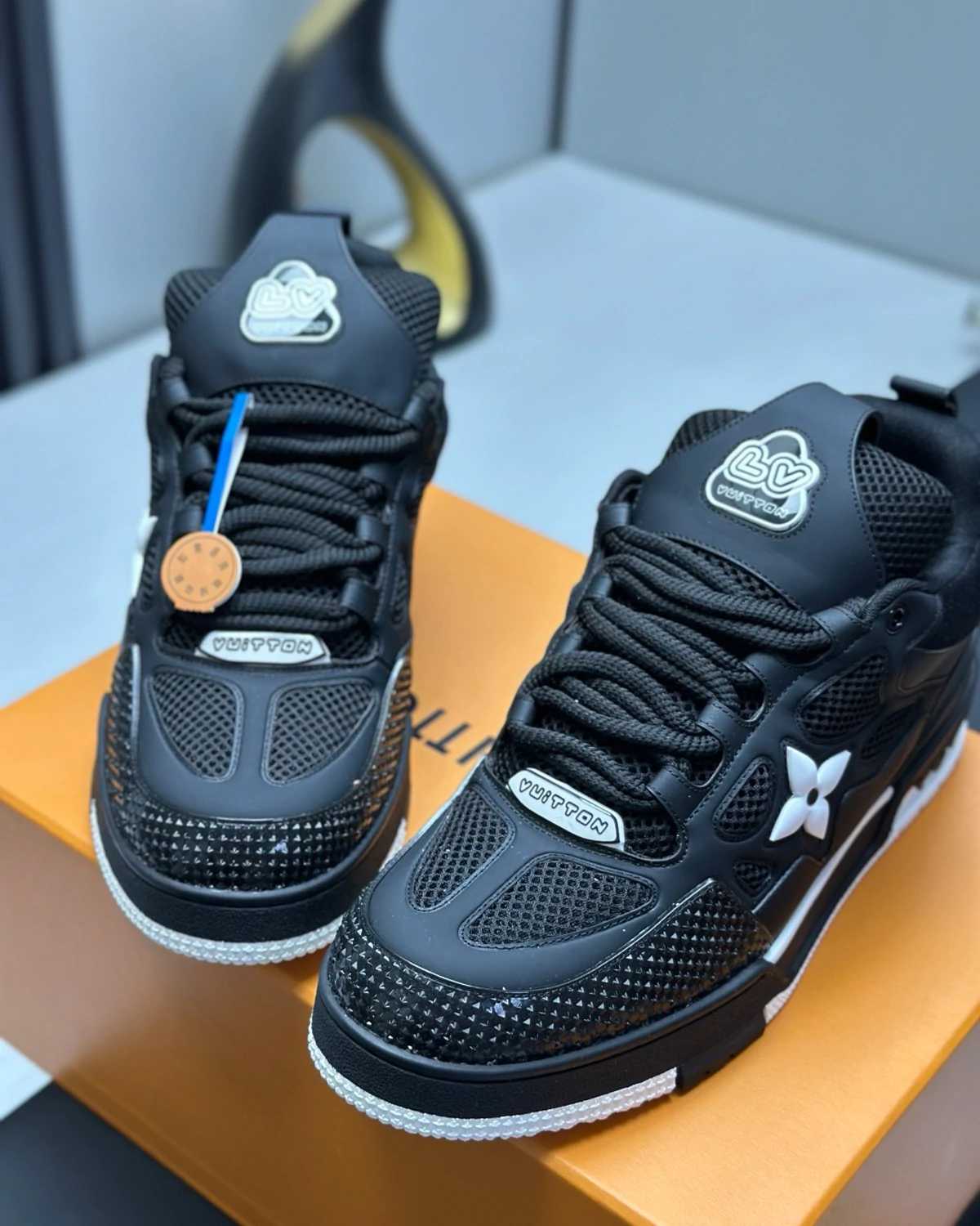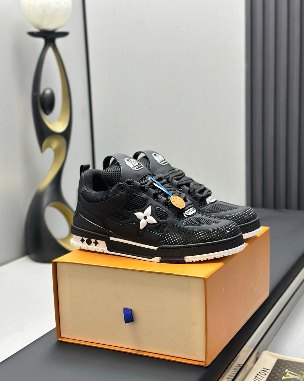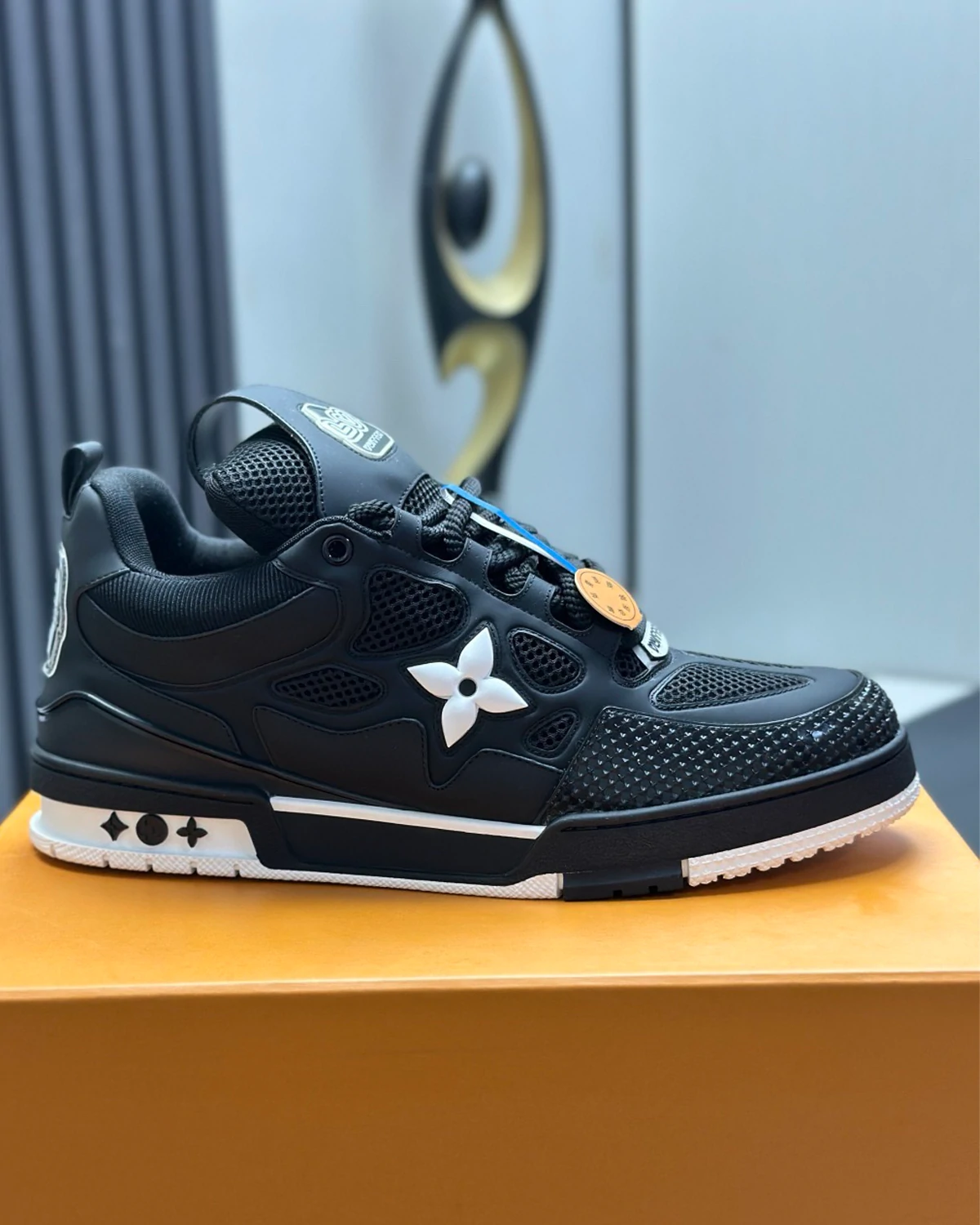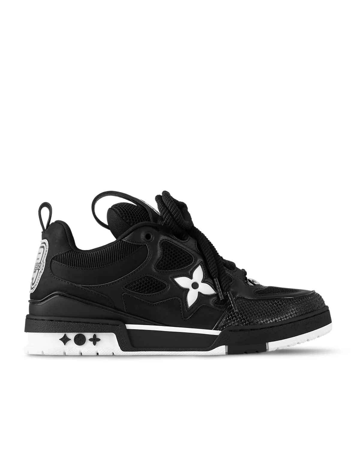 The LV Skate Trainers reference a 90s-inspired design first seen at Louis Vuitton’s Fall-Winter 2022 Men’s Show. Their elaborate, two-tone uppers with Monogram Flower detailing combine technical mesh, calf leather and suede. This model is notable for its padded collar, technical double laces and two-tone rubber outsole decorated with Monogram Flowers.