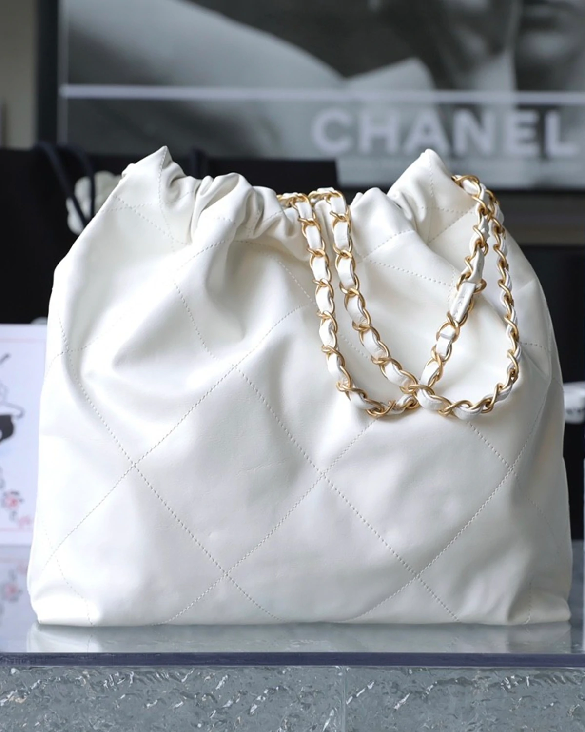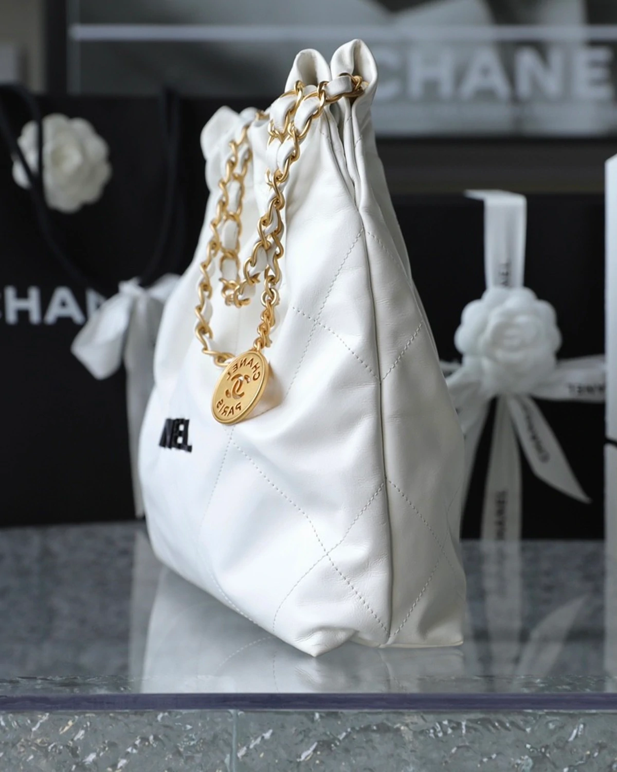 | Design Highlights | Slouchy soft texture ?? Lightweight & roomy ?? Black CHANEL logo hardware ?? Drawstring chain detail |