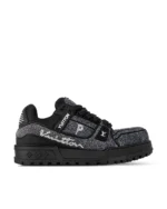 Cette sneaker LV Trainer Maxi revisite le mod??le embl??matique dans une silhouette oversize au go?t du jour. Recouverte de cristaux Swarovski? brillants, cette pi??ce d’exception est ponctu??e de l’initiale P du directeur artistique des collections homme, Pharrell Williams. La signature Louis Vuitton r??alis??e dans des cristaux plus clairs sublime le c?t?? de ce soulier par?? de lacets en tissu ??pais rehauss??s de perles.