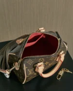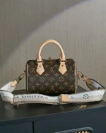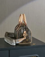 The Speedy Bandouli??re 20 hand bag takes on classic Louis Vuitton allure in Monogram canvas with natural cowhide-leather trim and gold-color hardware. Inspired by the House??s emblematic travel bag, its distinctive shape is adorned with two rolled-leather top handles, padlock. A detachable two-color strap, signed Louis Vuitton, enables shoulder and cross-body wear.