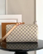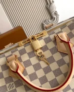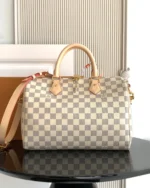 Classic Speedy 30 in white checkered canvas with natural cowhide trim, featuring adjustable strap and new hardware ?? lightweight, elegant, and practical for daily use.