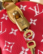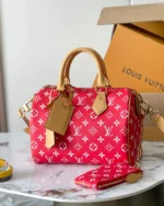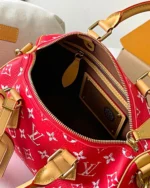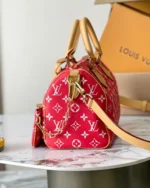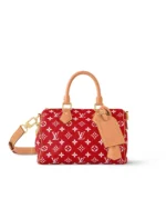 This Speedy P9 Bandouli??re 25 Monogram Leather takes on an ultra-luxurious feel in extra-soft calfskin with a Monogram print that mimics the aspect of Monogram on canvas. Creative Director Pharrell Williams?? attention to detail is visible in all aspects of this bag: from the polished golden hardware to the lambskin lining and the exclusive plaque inside the bag.