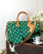 The Speedy P9 Bandouli??re 40 bag is made from extra-soft calfskin in a colorway inspired by precious stones. This less structured version of the iconic Speedy is body-friendly and very comfortable to carry. As part of Pharrell Williams?? cowboy-influenced collection for Fall-Winter 2024, the handle mounts feature embossed horses.