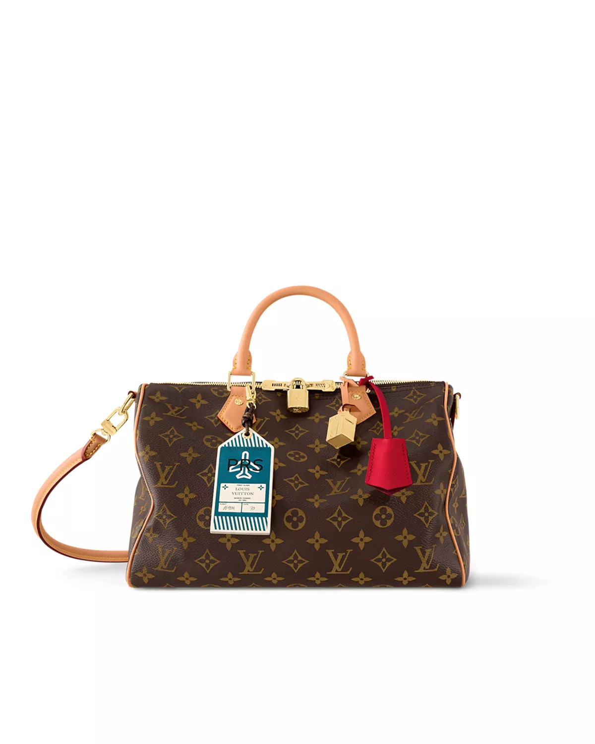 The Speedy Soft 30 Crafty ??Monogram Red?? is a bold reinterpretation of the classic Speedy, designed for effortless travel with a playful twist. Crafted from ultra-soft Monogram coated canvas, it features a vibrant red leather lining, a matching key bell, and whimsical charms??a boarding pass and trunk charm??that add character to this versatile piece.