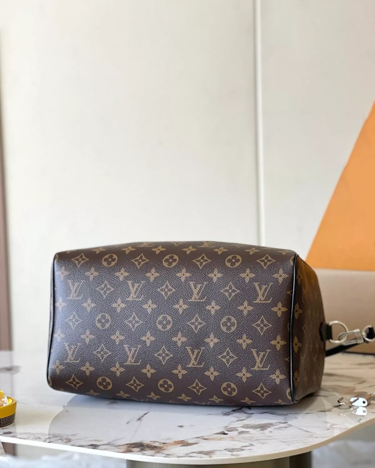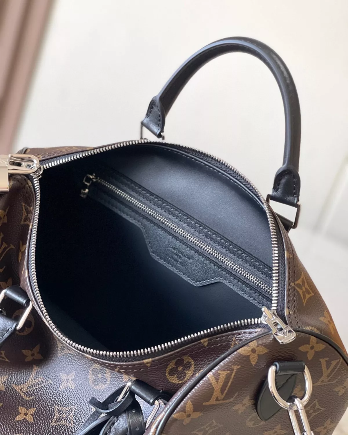 Make a bold style statement with the rebce Speedy Soft 30 ??Dark Edition??, a modern twist on the classic travel bag. Crafted from Monogram Black coated canvas with sleek leather trims and lining, this bag exudes confidence and edge. Its standout details include a gothic-inspired chain, name tag, and tassel, paired with a Toron handle for comfortable carry. The spacious interior, featuring a zipped pocket, fits all your essentials from a 9-inch tablet to sunglasses and wallet, making it both chic and practical for everyday or travel use.