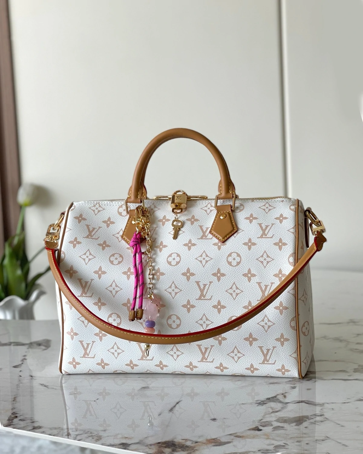 The iconic Speedy Soft 30 Lucky is reinvented with jewel-like embellishments and a contrasting pastel-pink lining to enhance its attention to detail. It is crafted from Monogram Dune canvas with VVN leather trims and is adorned with gold-toned hardware, plus a unique talisman charm and colorful rope knot. Capaciously sized, the versatile design is roomy enough to store a tablet as well as other daily essentials.