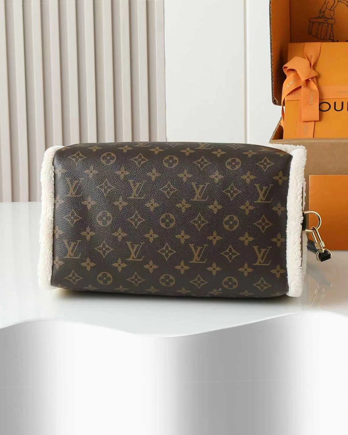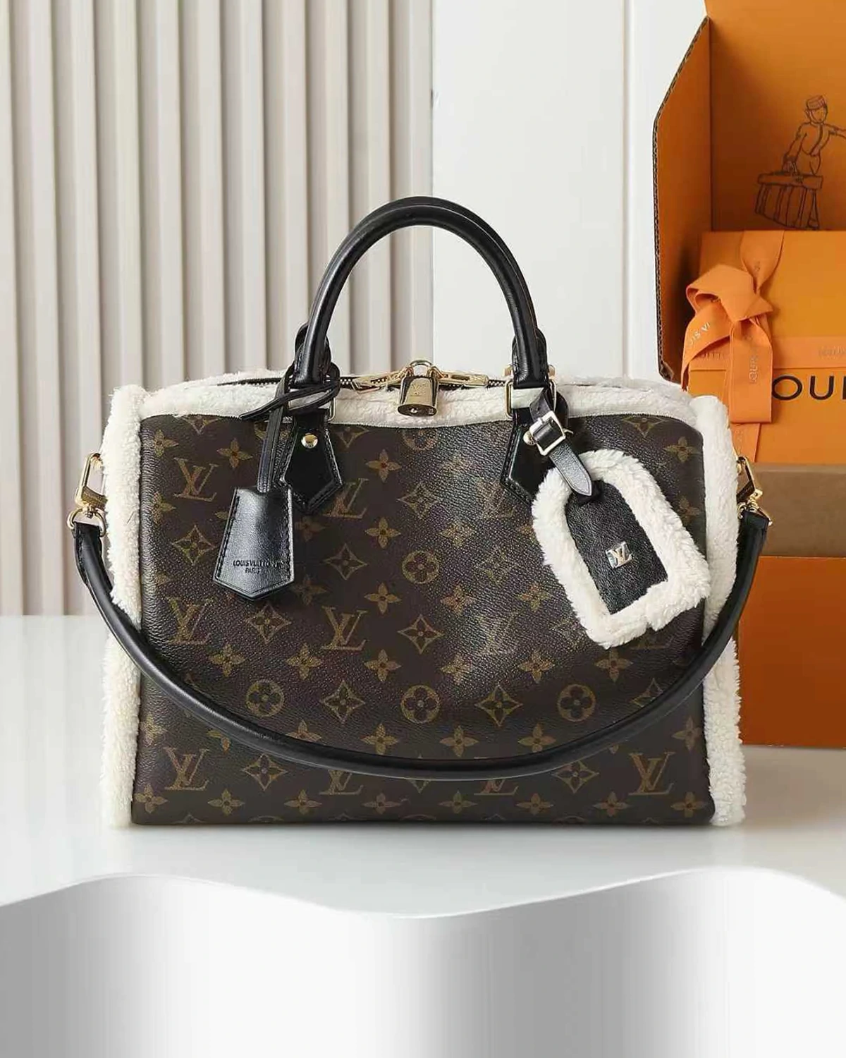 This Speedy Soft 30 Teddy, available only this season, is the perfect stylish choice after a ski trip. Crafted from Monogram canvas and trimmed with warm, soft sheepskin, it exudes a retro charm. The special edition features a signature luggage tag, paying homage to the brand’s iconic travel heritage and craftsmanship, and includes a Toron handle on top.